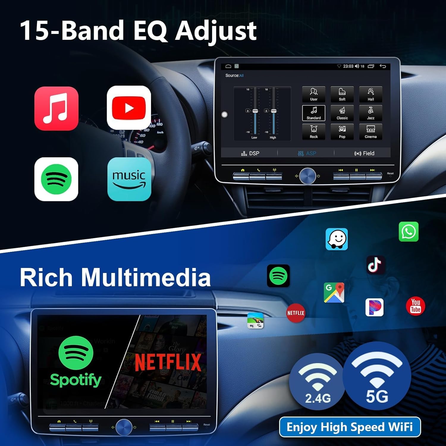 Operation System: Android 13.0 System, 2 GB + 32 GB. 28NM chip process with 4*A7 CPU, Greekbench score up to 27000+.10.1 Inch 1280*720 QLED Screen: 10 inch floating screen has 178° full-viewing angle, outstanding brightness, clear viewing for immersive entertainment.Live Rear-view: 10 inch double din supports Live-Rearview and display the rear view even when vehicle is moving forwardDSP / Pre-Amplifier: DSP+15EQ. Built-in Digital Signal Processor allows you to set precise equalization, signal delay, bass boost, and bass filter; Max output 4*45W amplifier with RMS 4*24W.Wireless Connection: 2.4G wifi, bluetooth, wireless apple carplay, wireless android auto.Voice control: Siri through Apple carplay; Google assistant through android auto.Online/ Offline Map Navigation: Online in CarPlay/ Audroid Auto, directly with map apps on car radio; offline with downloaded maps (built-in GPS).Physical Volume Button: Practical physical control button makes it more safe during driving.FM Radio: Listen to real-time radio, weather forecast, news and more.Steering Wheel Control: Using the vehicle’s existing steering wheel control buttons to control the head unit, safer and easier.Built-in/External Mic: Combined with built-in mic and external mic, answer or make calls much clearer and more stable.