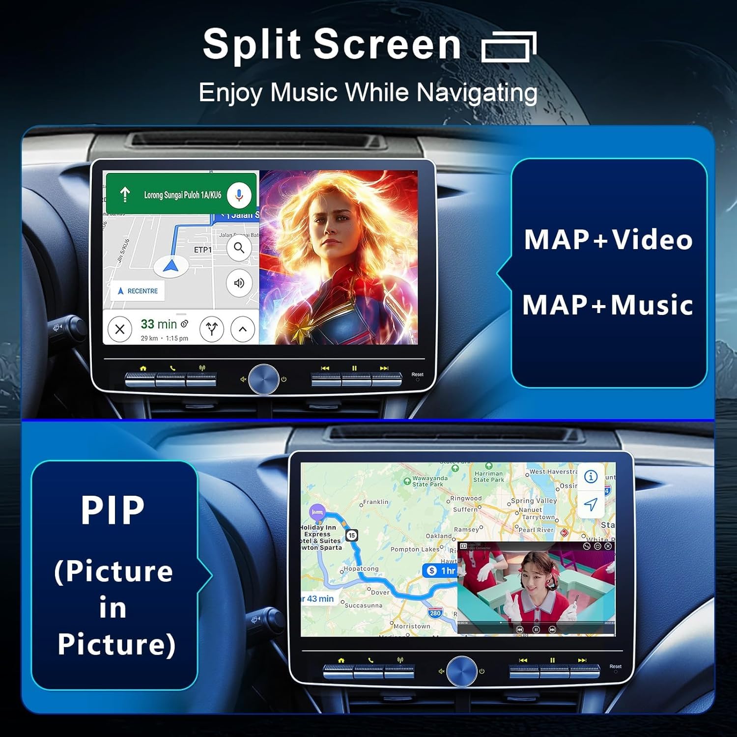 (Detachable & Knob Design Carplay Stereo): Floating and detachable design 10 inch double din car stereo can be adjusted in three directions, you can enjoy a better viewing angle in watching map navigation, HD video etc. Worry-free of screen reflection.Rich knod design makes it very easy for you to adjust volume, wake up voice assistant or go navigation.