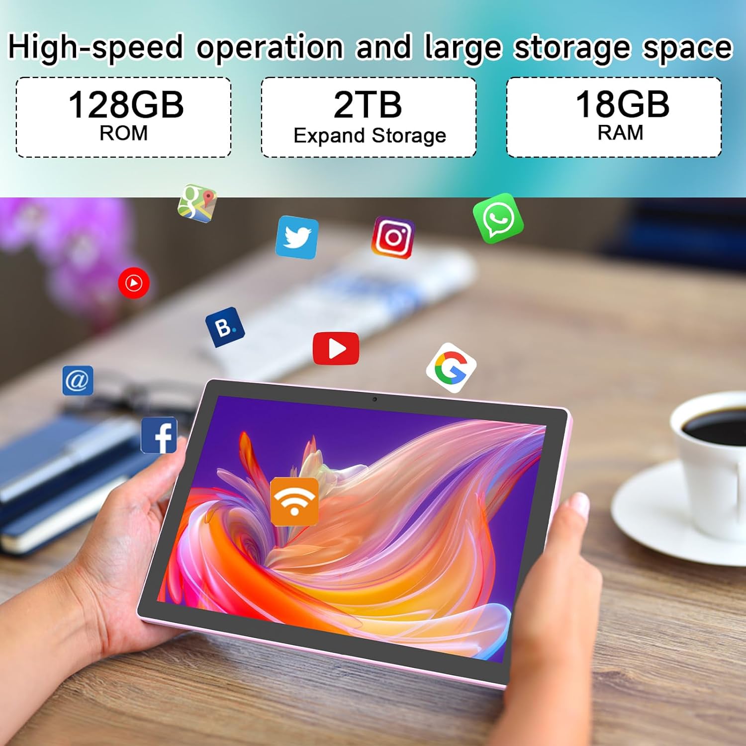 【Faster Responsive Performance】Our 10 inch tablet is equipped with the latest and more stable Android 15.0 system, with a 2.0GHz quad core CPU and support for G sensors. 18GB RAM (including 12GB expansion) and 128GB ROM, with a microSD card slot that can scale up to 1TB, allowing more applications, songs, videos, and images to be saved directly on your tablet.
