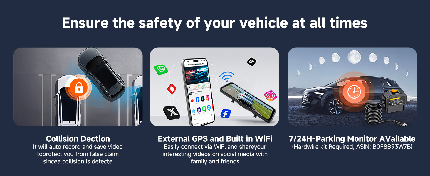 【Parking Monitor & G-Sensor 】The rearview mirror camera features a 24-hour parking monitor. Time-lapse mode records at a low frame rate to conserve power and storage while ensuring continuous surveillance of your vehicle.Car camera has G-sensor detects collisions and locks the current video, Providing valid evidence within the locked footage. Your road stories are securely archived.(A hardwire kit is required for parking monitoring-ASIN:B0F8B93W7B)