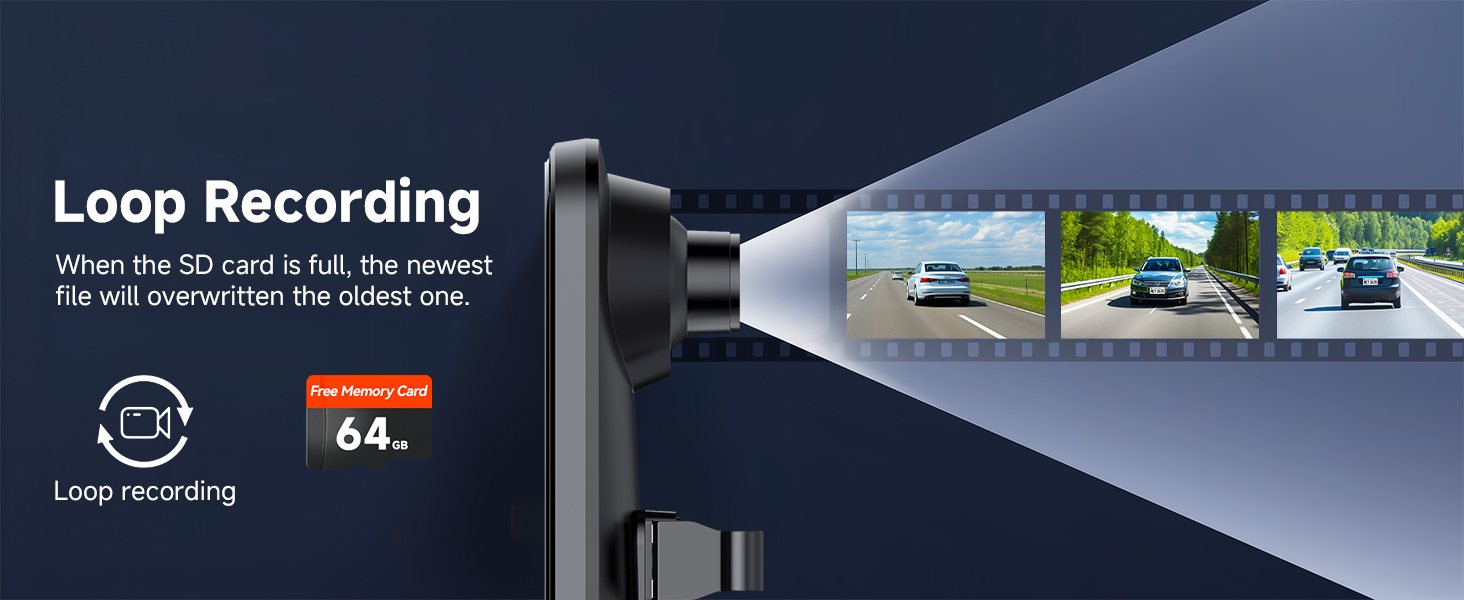 【Loop Recording & 64G Card】 Rear View Mirror Dash Cam give a free 64G card, which can continuously store high-definition driving images for a long time, which is enough to meet your video storage needs for daily commuting, long-distance travel or emergency. When the memory card space is full, the device will automatically overwrite the earliest recorded video clips, ensuring that every important moment on the road can be completely recorded without you having to manually clean up the memory.