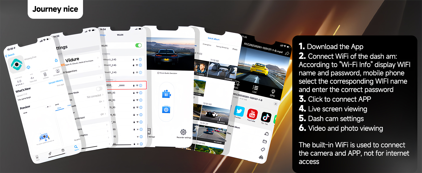 【External GPS & Built in WiFi】Rear view mirror camera combines built-in WiFi with an external GPS. Connect your phone via WiFi to adjust settings, review/ download videos instantly, or share clips to social media. The GPS tracks routes, real-time speeds, and precise locations—ideal for enhancing safety and providing detailed records.