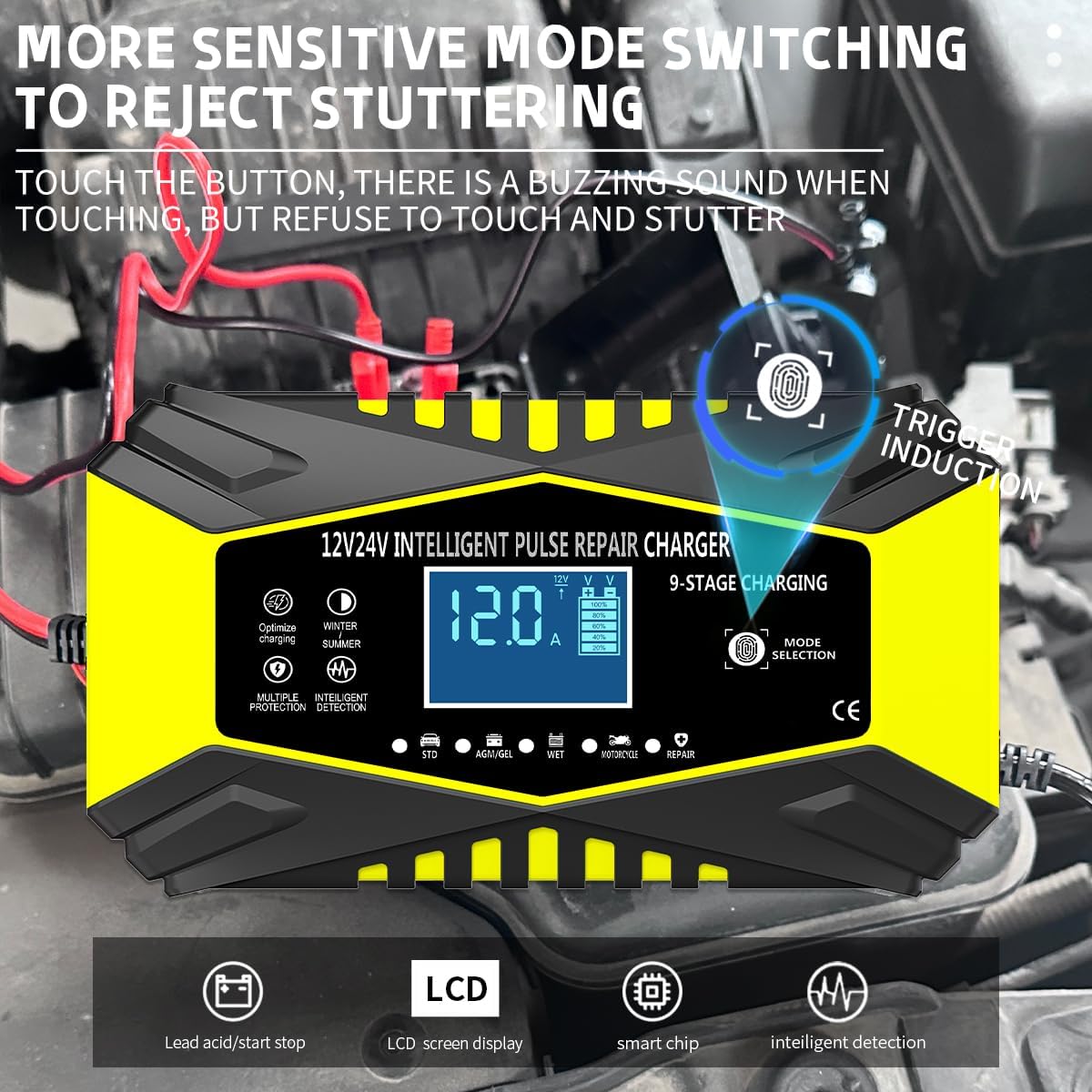 Nine-stage charging function, the product has a nine-stage charging mode, which are respectively, devulcanization, trickle charging, constant current charging, constant voltage charging, battery current detection, compensation charging, floating charging, optimized charging, and small current charging. When the charger charging screen shows the battery charge bar full (100%) showing FUL, it is recommended to continue floating charging and optimize charging. The effect of small current charging is better for about 1 to 3 hours. The battery is charged more fully until the screen displays OFF and the shutdown is complete.