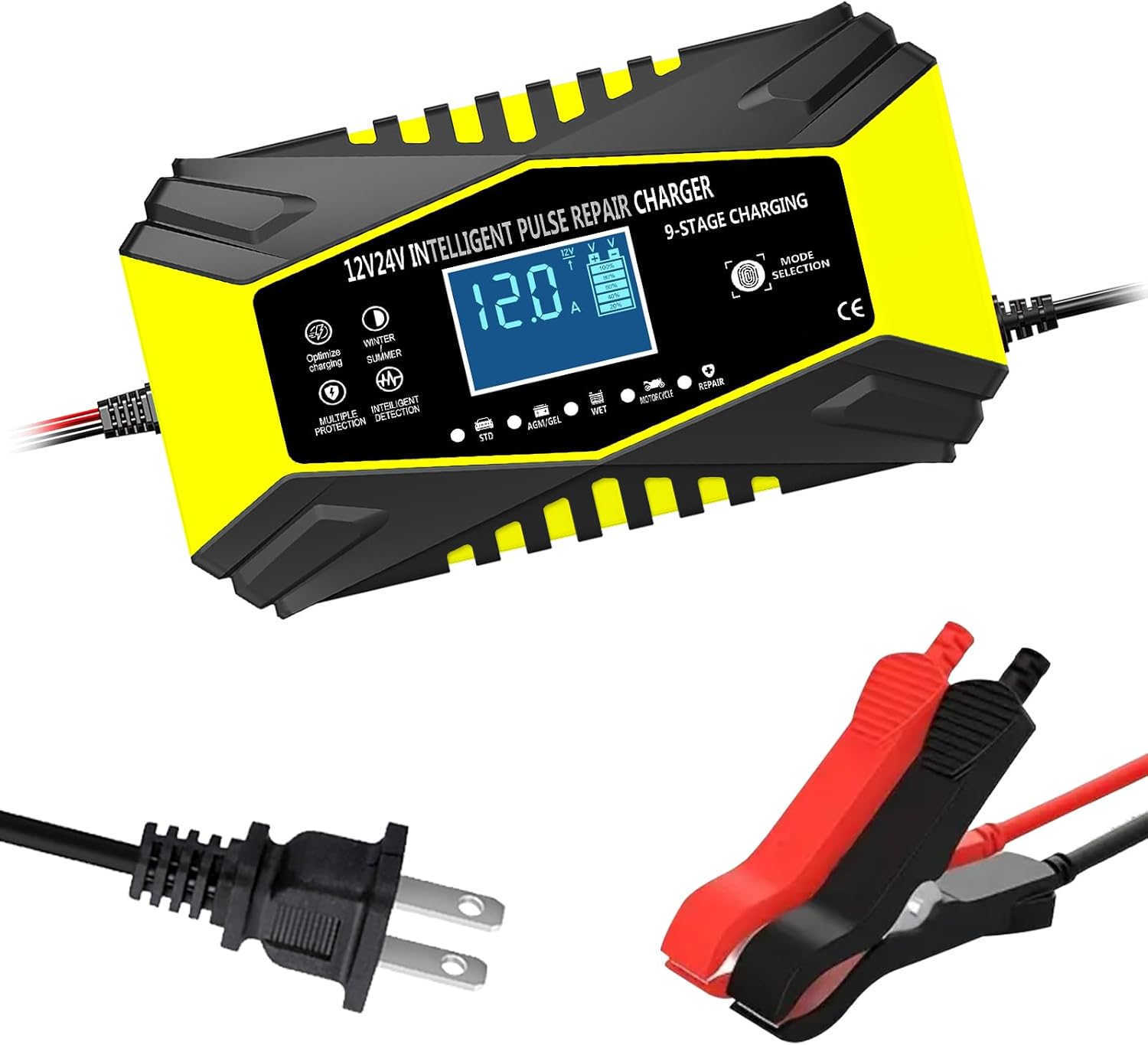 Large screen display, LCD display battery charging status, current, voltage, ambient temperature, charger distribution temperature, charging bar cell percentage, winter and summer mode, reverse connection tips, etc., easy to use, full power stop.