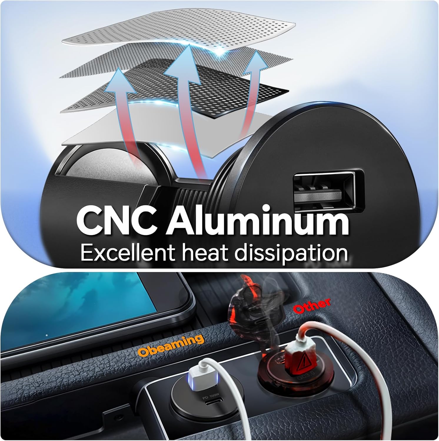 Brand Obeaming Connector Type QC 3.0 USB-A + PD3.1 USB-C Number of USB Port 2 Input Voltage DC 12V-24V Material CNC Milled Aluminum Power Source Corded Electric USB-C Output 5V/ 9V/12V/20V/28V Max 100W USB-A Output 5V//9V/12V Max 18W Safety Protect Intelligent Multi-Protect Compatible Devices Smart Phones, Laptop,Tablets, More USB-A&USB-C Power Device,Drone,Dash Camera, Driving recorder, Portable Power Bank