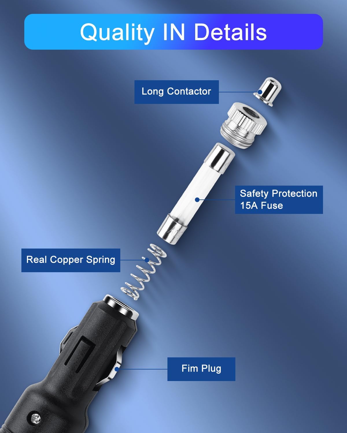 【Safety-First Design】Built-in 15A replaceable fuse prevents overcurrent and short circuits, automatically cutting off power during faults. Supports 12V systems (max 180W) for safe use with car appliances.