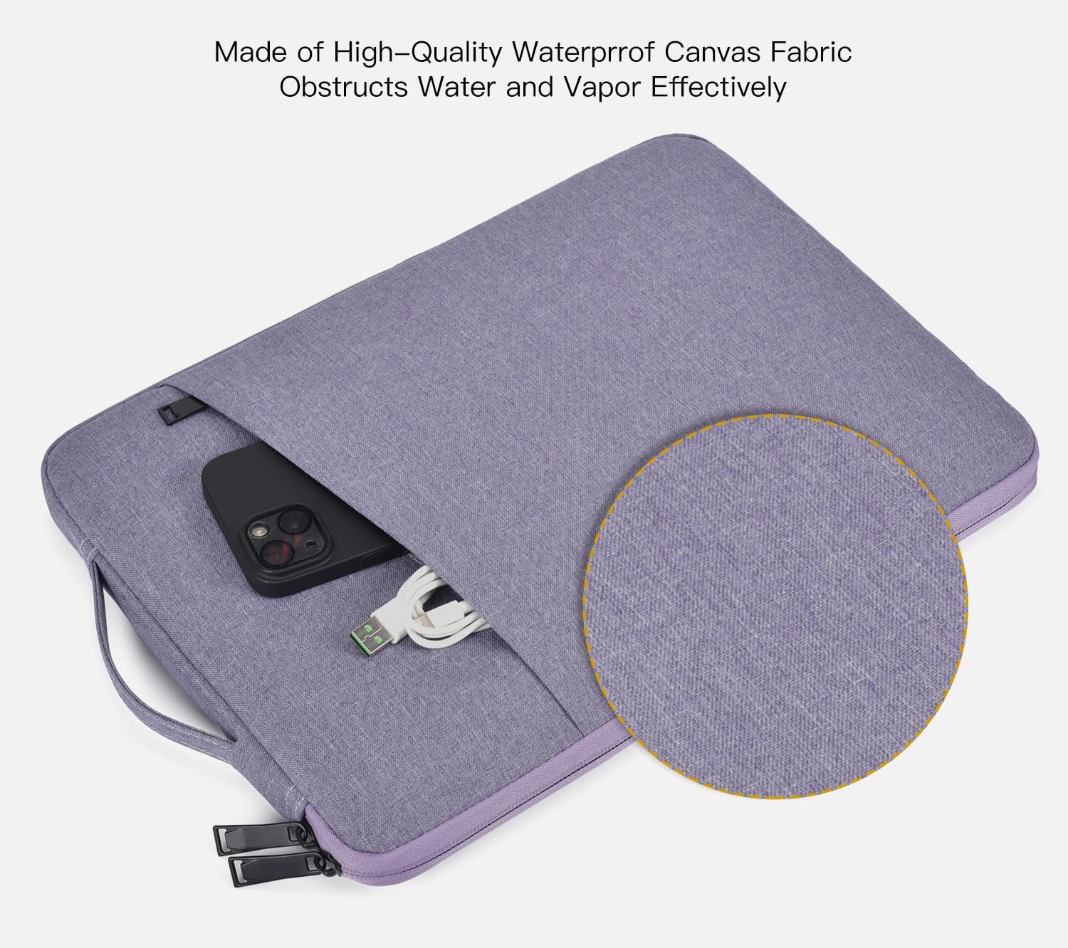 The 14 inch laptop case made of high-quality waterproof Canvas fabric, which obstructs water and vapor effectively. Our sleeve case also provide additional storage space for smaller items, such as a mouse, earphones, pens, cell phones, notepads, and other accessories