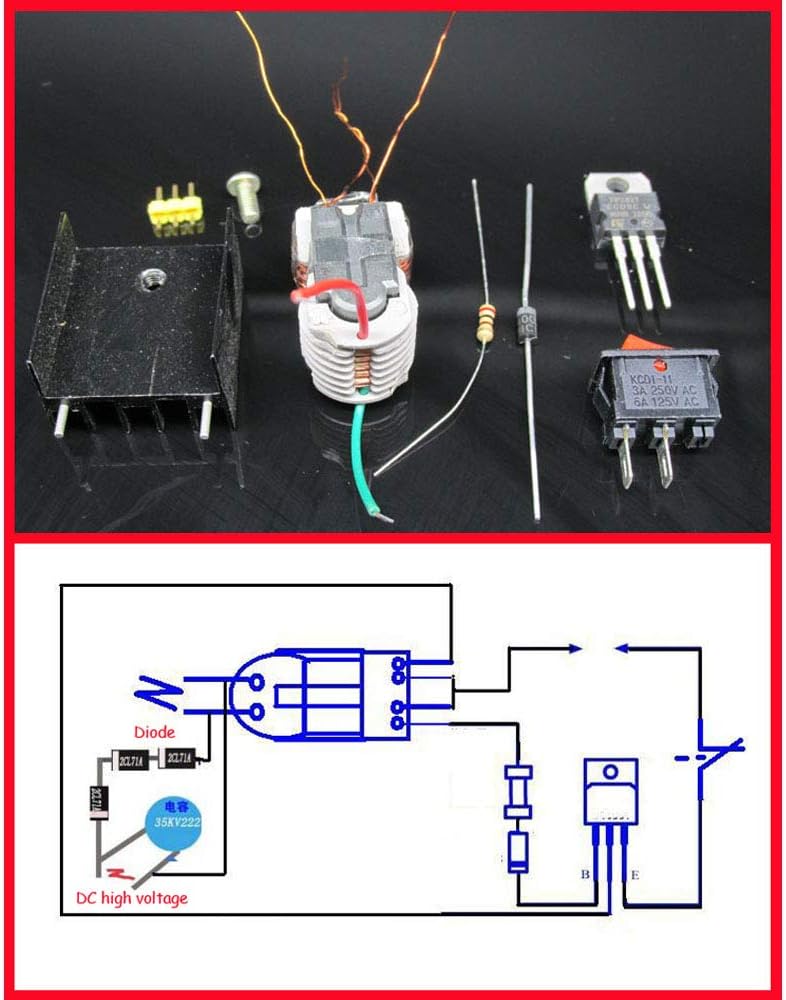 This kit is made for the booster coil and has a professional circuit diagram for the convenience of electronics enthusiasts.1 set of list:PCB Board/120 ohm resistance/UF4007 ultra-fast recovery diode/N20 transistor/Heat sink/M3 * 6 screws/Boat switch/Pin header (3-8 Pin random)