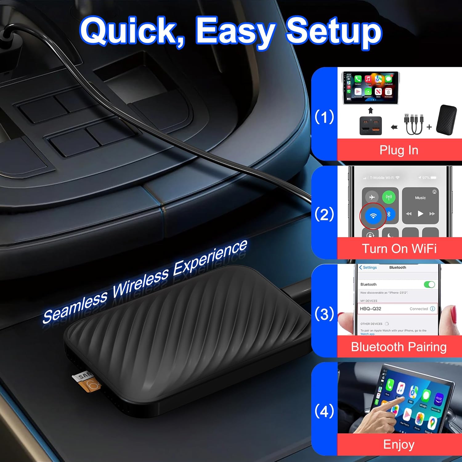 Wireless CarPlay & Android Auto Adapter: Upgrade your car’s infotainment system with our cutting-edge wireless CarPlay adapter and Android Auto wireless adapter. Say goodbye to messy cables and enjoy the freedom of a wireless connection. Effortlessly convert your car’s wired CarPlay system into a seamless wireless experience that pairs instantly with your compatible iPhone or Android device, transforming your daily drives into a modern, high-tech journey.