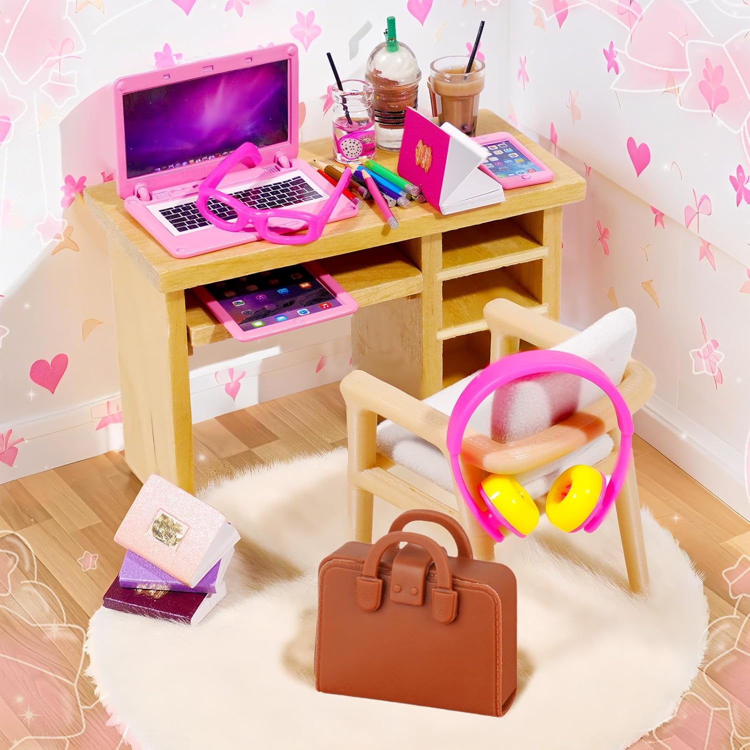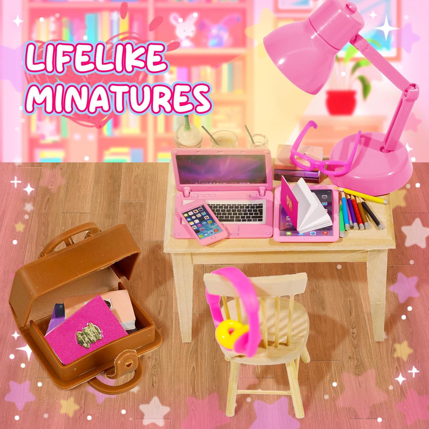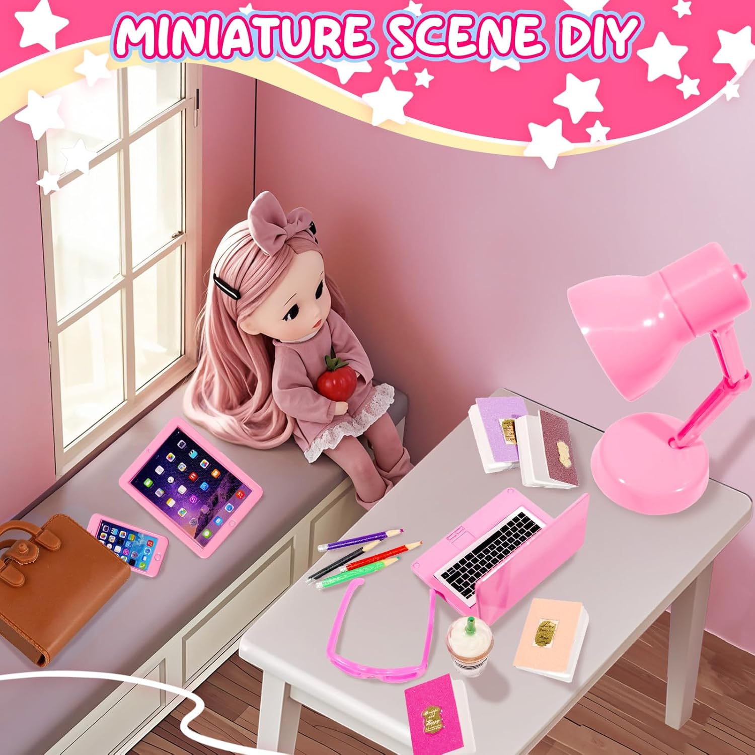 PACKAGE INCLUDED: 1 mini laptop, 1 mini tablet, 1 mini mobile phone, 1 mini pink headphones, 1 mini pink glasses, 4mini books, 1 mini juice, 1 cup of coffee, 1 cup of milk tea, 1 mini bag etc.