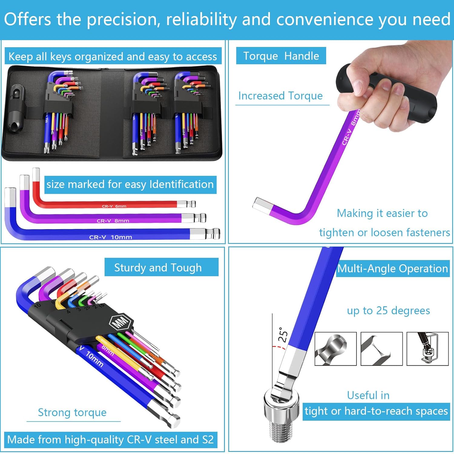 Handy Colour-Coding:The colour coded handles make it easy to find the right key. Each tool is individually powder-coated in a unique colour to distinguish between sizes quickly and easily. Easy to use.
