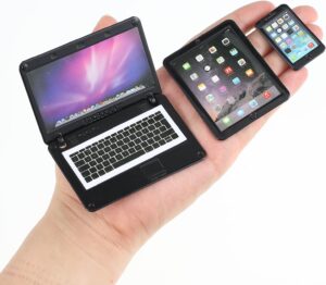 【Package includes】Miniature dollhouse accessories includes 1Pcs Mini Tablet, 1Pcs Mini Cell Phone,1Pcs Miniatures Metal Laptop, Mini laptop can stand open. Mini Laptop: 1.18′ x 1.8′ ( 30 mm x 46 mm ); Mini Tablet: 0.79′ x 0.98′ ( 20 mm x 25 mm ); Mini Smart Phone: 1.1′ x 0.6′ ( 26 mm x 15 mm )