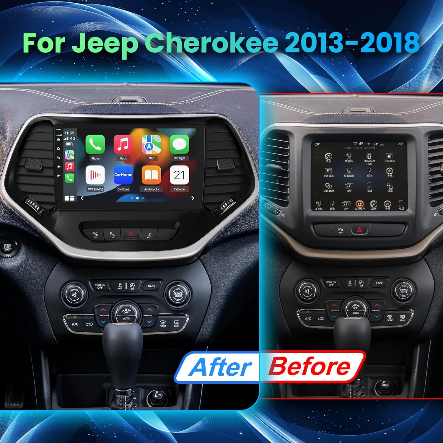 【Wired/Wireless CarPlay & Android Auto】Android 13 car stereo for Jeep Cherokee 2013-2018 supports wired/wireless Apple CarPlay and Android Auto, With wired connection or wireless connection through Bluetooth, you could more easily access the apps of your phone. You can also able to wake up the voice assistant Siri or Google Assistant to operate Apps on your phone, easily use GPS navigation, calls, message, music, and much more functions while keeping your hands free for safe driving.