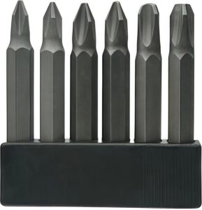 This premium 6-piece JIS Phillips screwdriver bit set comes with a convenient 6-slot storage strip to keep your tools organized. Each 50mm (approximately 2-inch) bit is precision-crafted from durable S2 alloy steel for maximum strength and longevity. The specialized JIS (Japanese Industrial Standard) Phillips head design is specifically engineered to prevent cam-out and provide optimal fit for Japanese manufactured equipment. Perfect for working on Japanese vehicles, motorcycles, boats, and bicycles where standard Phillips head bits may slip or damage screws. The compact storage strip keeps bits secure and easily accessible while protecting them from damage. Each bit features precise machining for exact screw head fit and optimal torque transfer. The set includes the most commonly used JIS Phillips sizes to handle a wide range of maintenance and repair tasks. The robust construction ensures these professional-grade bits will maintain their shape and effectiveness through repeated heavy use.
