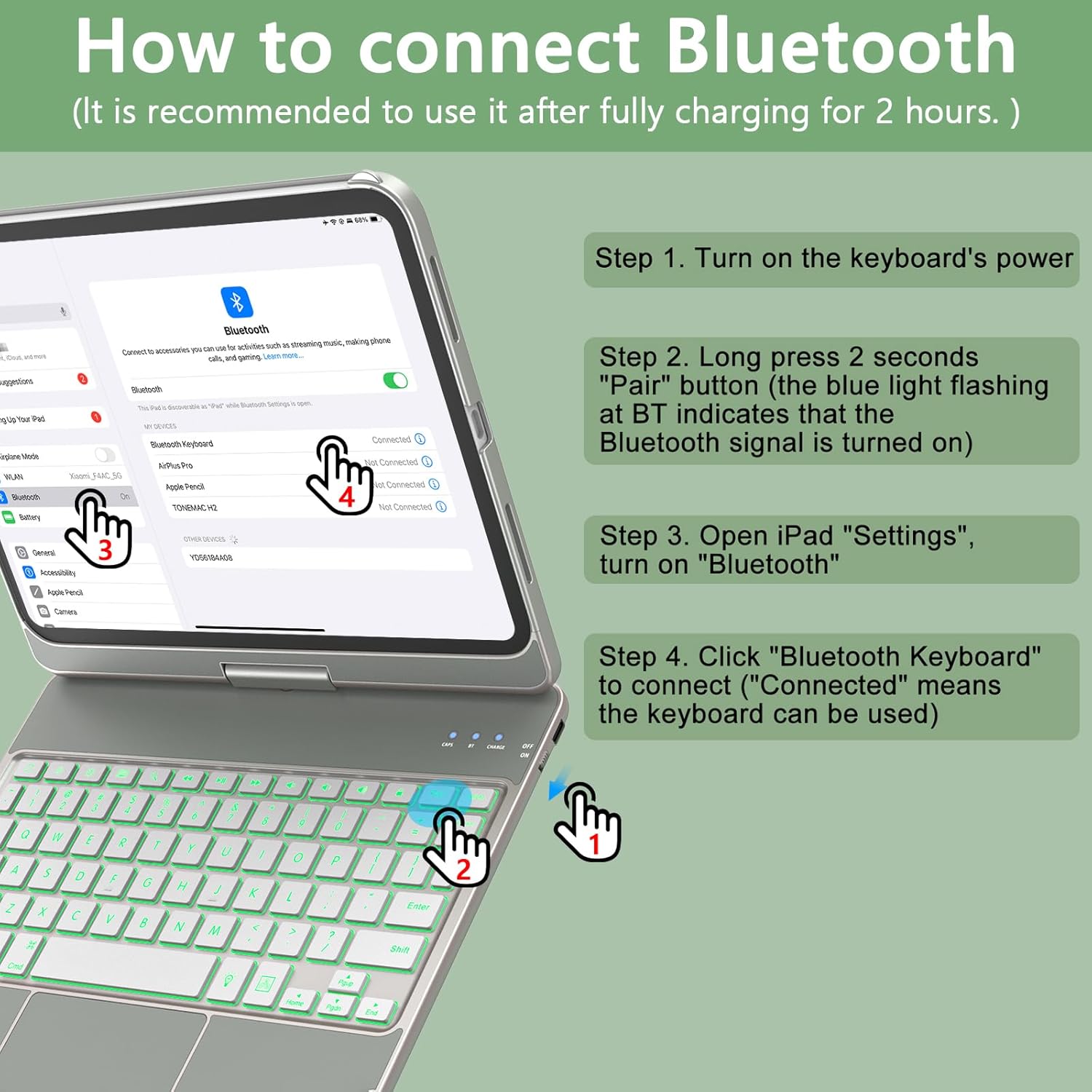How to connect: When the ipad 10th generation case with keyboard is fully charged for 2H. Step 1: turn on the keyboard’s power switch. Step 2: Press”Pair” for 2-3 seconds,the indicator light “BT” flashes to indicate that the BT Signal is turned on. Step 3: Open “Settings” on ipad, click “Bluetooth”, and click “Bluetooth Keyboard” to pair and connect (If the problem of not being able to connect, it is due to the limitation of the ipadOS system, you only need to forget the BT data and reconnect)