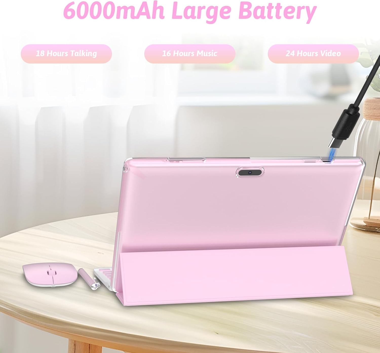 【Portable 2 in 1 Tablet with Keyboard】 This 10.1 inch android tablet equipped with a bluetooth keyboard, wireless mouse, and stylus as well as a foldable protective case, allowing you to seamlessly transform your 10” tablet into a laptop-style device. This versatility makes it the ideal device for those who need to be productive on the go, whether it be for work, study, or play.