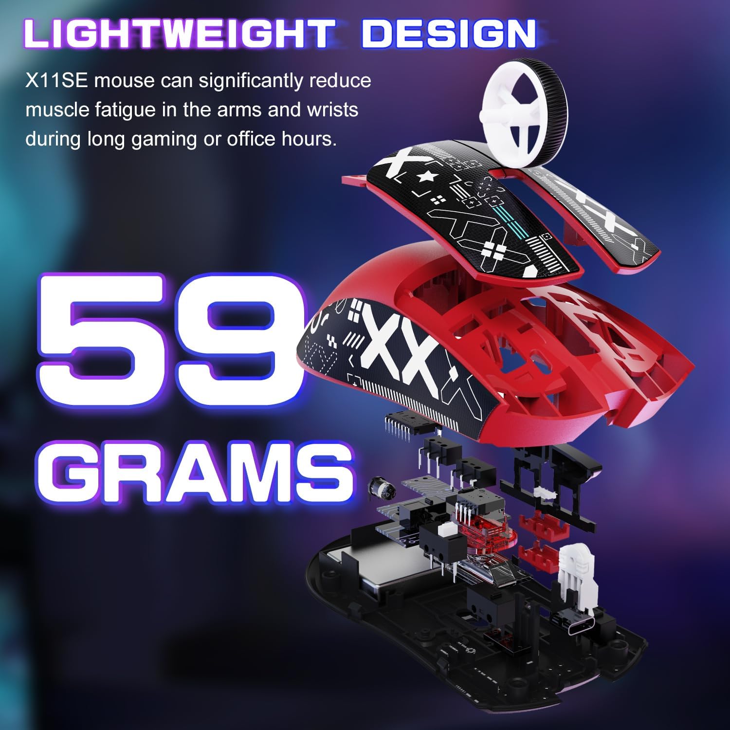 【Ultra-Light 59g Ergonomic Design】Weighing just 59g, the X11SE gaming mouse is even lighter than Attack Shark X11. Its optimized internal structure allows for quicker, more responsive movement—perfect for FPS gamers. The ergonomic shape fits naturally in your hand, reducing fatigue during extended gaming or work sessions.