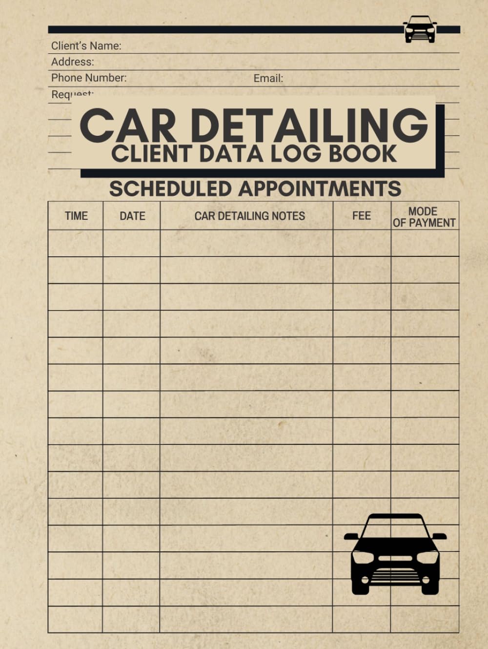 Features of this log book (check the cover and use the “Look Inside” feature for more details):Size: 8” x 11”, perfect size for a log book.Fresh 90 GSM 110-pages.Includes spaces for recording:Client’s NameAddressPhone NumberEmailNotesTimeDateCar Detailing NotesFeeMode of PaymentSoft-touch matte cover.Elegant and beautiful cover that will captivate the heart of any car enthusiast, car detailer, etc.Durable materials, ideal for a quality-feeling journal.Fast delivery by Amazon.If you are looking for the best way to maintain a record of your car detailing services, then scroll up and click the “Add to Cart” button right now.