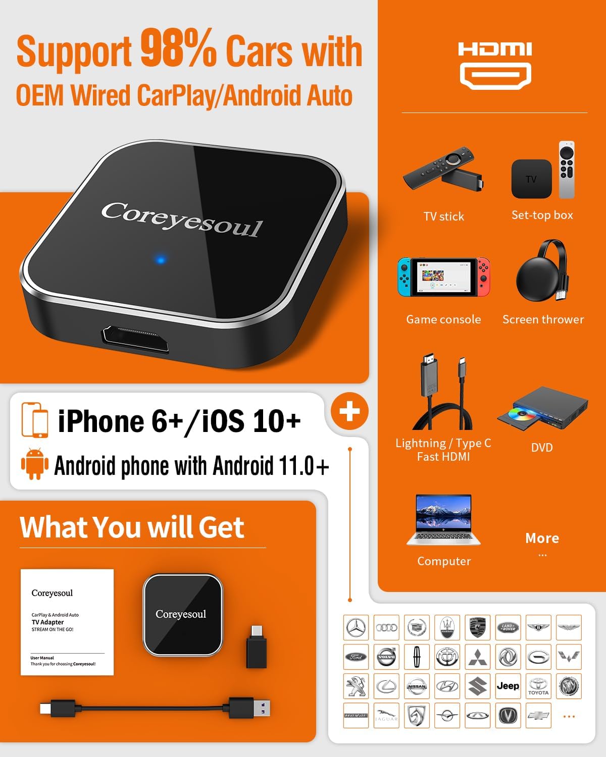 Compatibility Alert: Your car must already have wired CarPlay or Android Auto for Car TV Mate Pro Max to function. Compatible with iPhone 6 +/iOS 10.0+ and Android 11.0+.