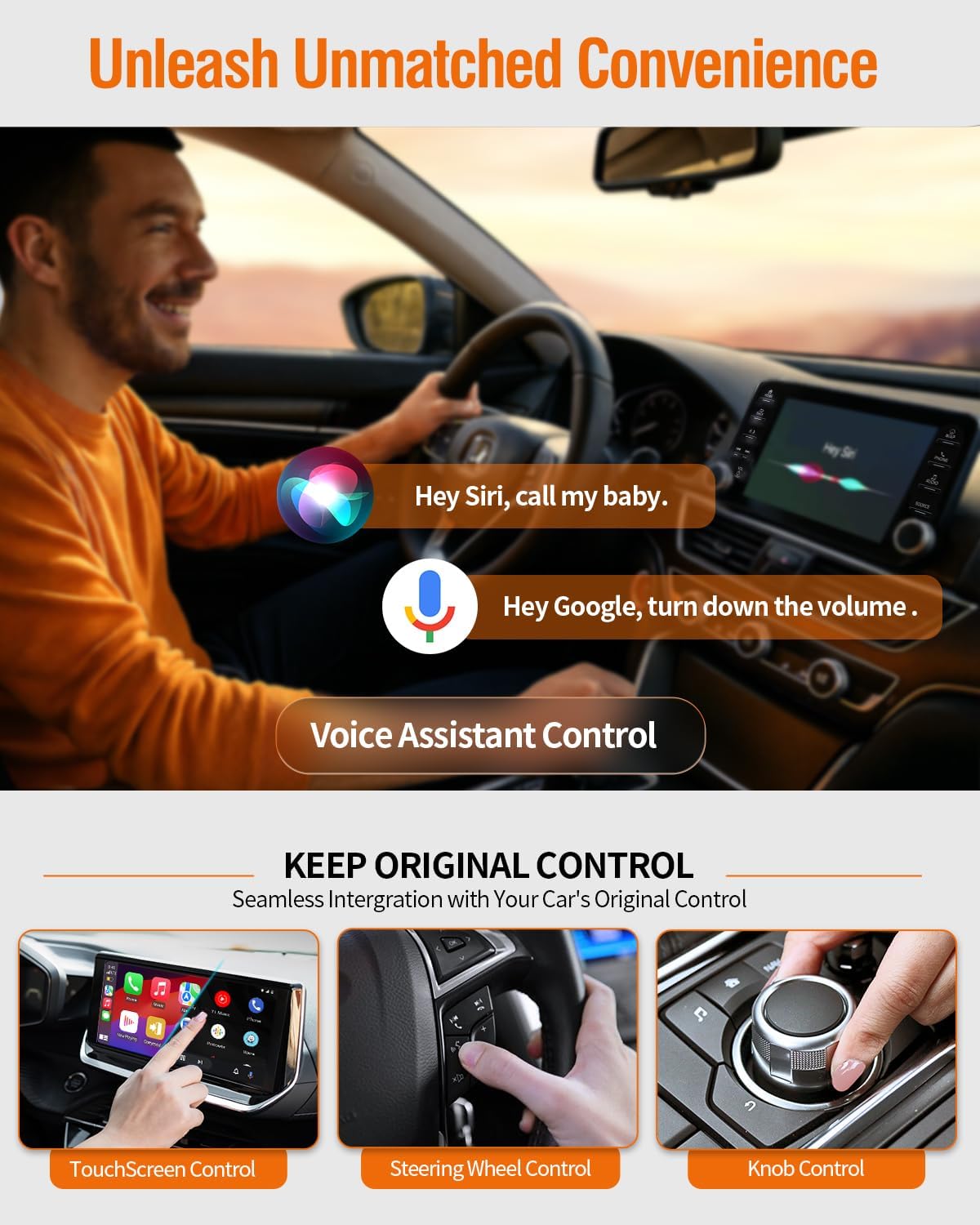 Wireless CarPlay Adapter: Transform your CarPlay from wired to wireless seamlessly! Enjoy All CarPlay functionalities and keep original car operation. No more tangled cables, leaving your car tidy and embracing the convenience of wireless Car Play.