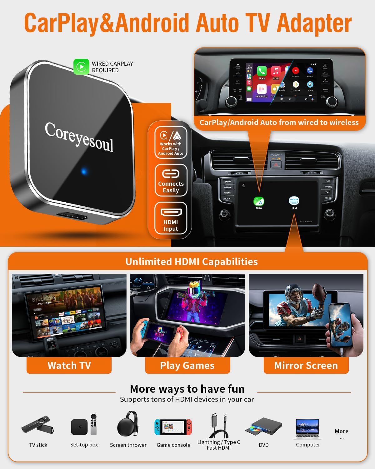 Car TV Mate Pro Max: This cutting-edge device transforms your driving experience by converting Wired CarPlay&Android Auto into Wireless. But that’s not all–with its HDMI input, you can plug in a TV Stick or other media devices to stream your favorite shows and apps directly on your car’s infotainment display.