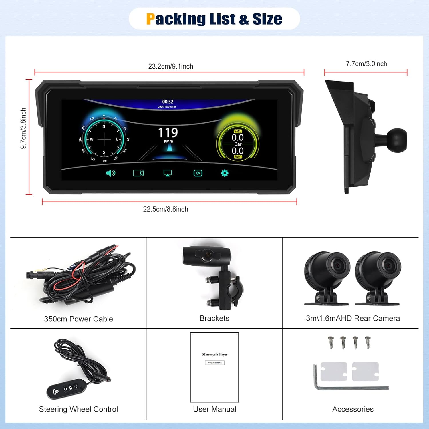 (Bluetooth and Dual Front and Rear Cameras) Motorcycle screen carplay built-in Bluetooth, enables wireless connection between cell phones and in-car systems. You could use hands-free calls, stream Bluetooth music, easy to pick up a phone call, improve driving safety.Built-in front and rear high-definition cameras to restore road details