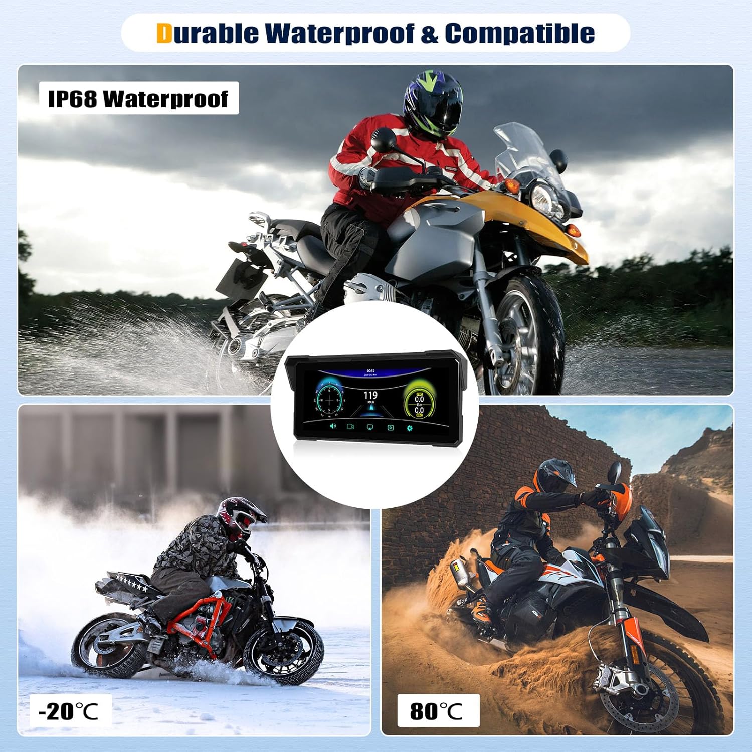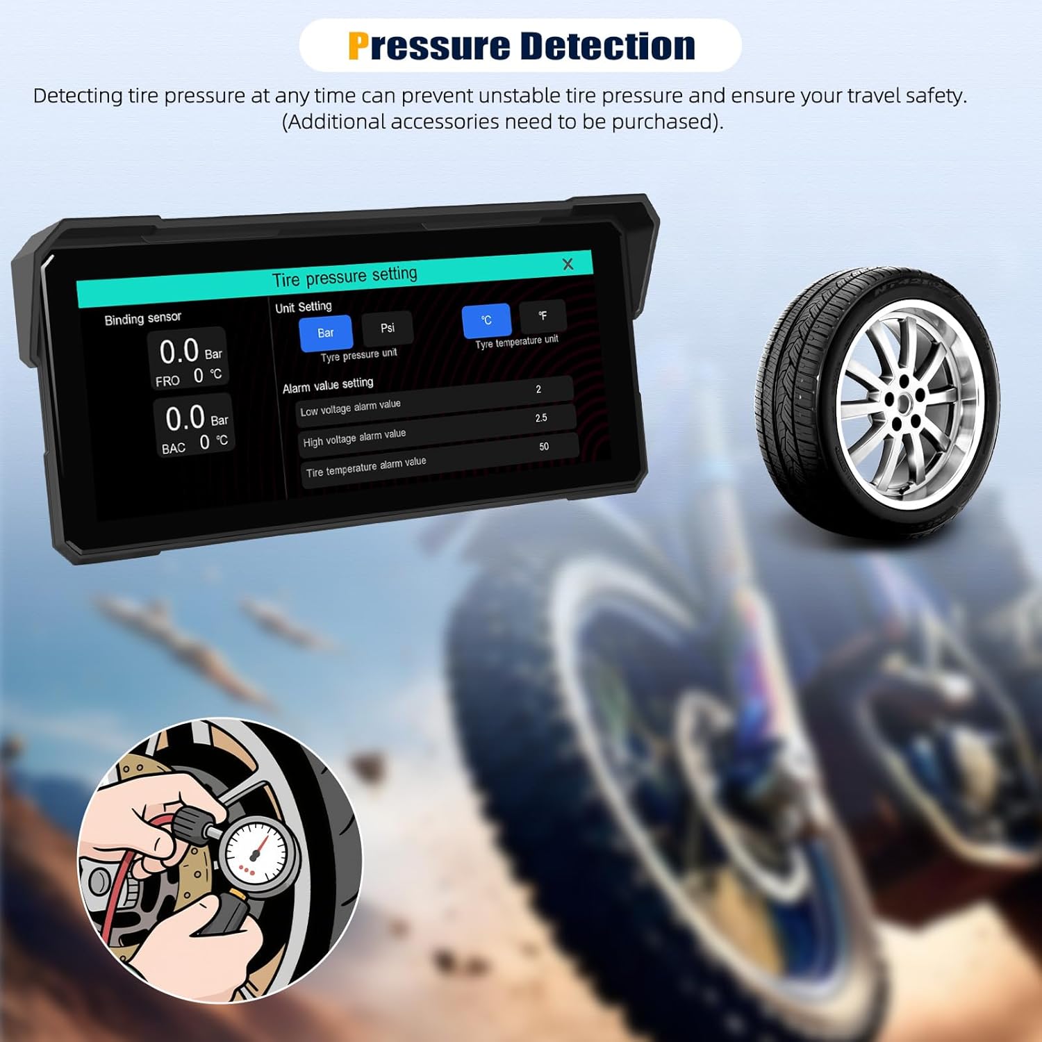 (IP68 Waterproof and Tire Pressure Monitoring) This wireless carplay for motorcycle features durable IP68 waterproof materials.The quality of the materials and craftsmanship give one confidence in their durability,easily withstanding the rigors of the road,ensuring the motorcycle screen remains functional and reliable in all weather conditions.Check tire pressure at any time to prevent unstable tire pressure and ensure your travel safety(Requires purchase of additional accessories)