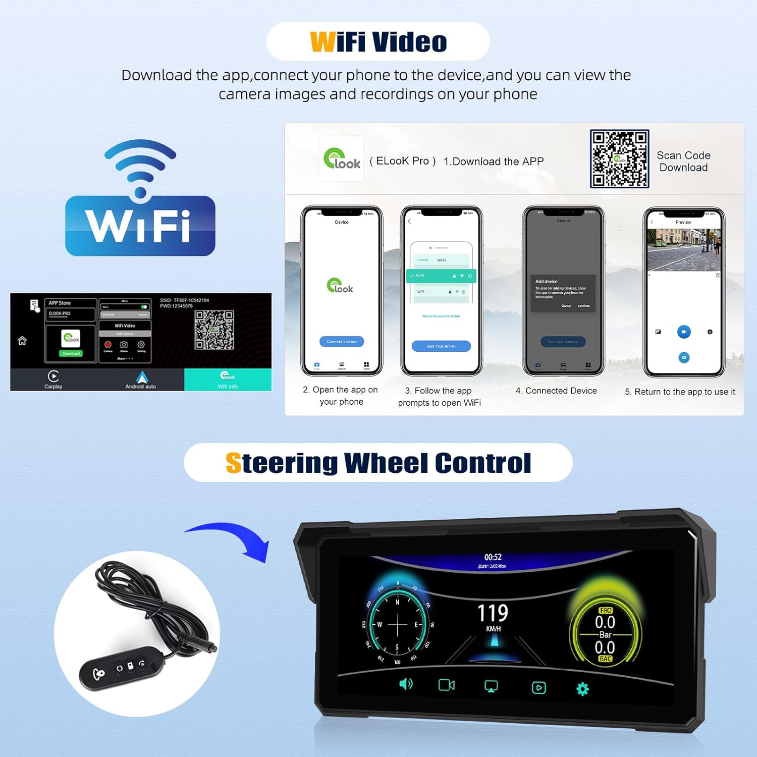 (Plug and Play&Steering Wheel Control) This wireless carplay for motorcycle is suitable for all motorcycles. You could mount it on the handlebars of your motorcycle, the package comes with a mounting kit and tools to ensure stability. All you need to do is plug the power cable into the port of the screen,connect the power adapter to your motorcycle’s power supply and the device will turn on and be ready to use