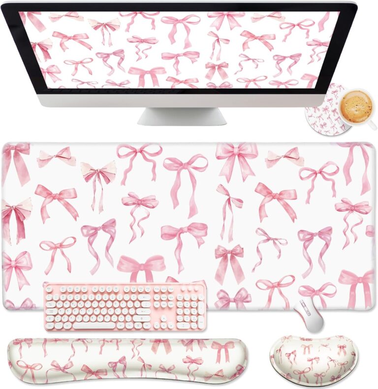 Features: Comprehensive package: Elevate your workspace with our enchanting pink desk mat set. The delightful pink bow keyboard mat measures 35.4 x 15.7 inches, providing ample space for your essentials. This chic set includes a…