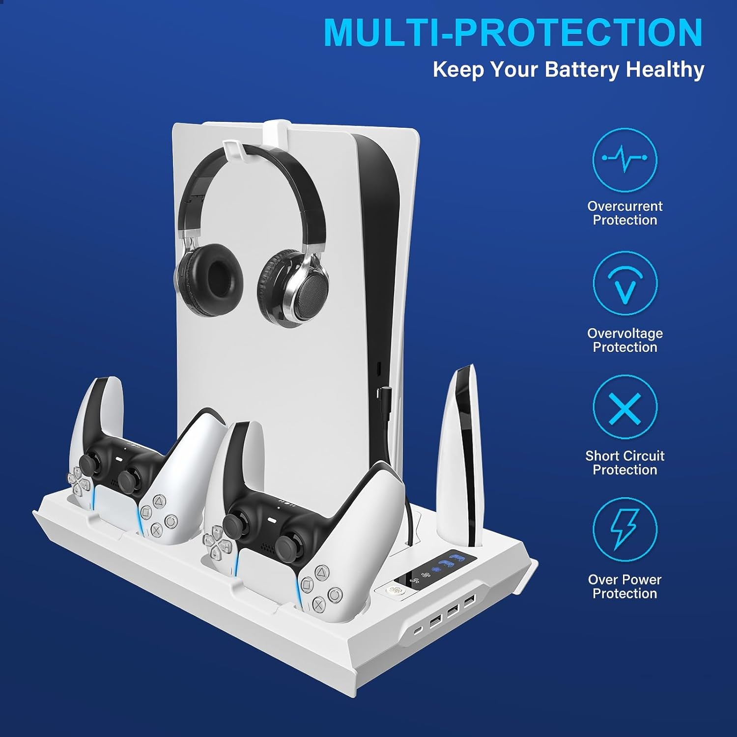 Overcharge Protection: Integrated smart chips prevent overcharging, automatically stopping at 70% to extend controller battery life. The docking station is designed to minimize wear on the charging ports, ensuring long-term durability. (Note: PS5 console, controllers, headset, and media remote not included.)