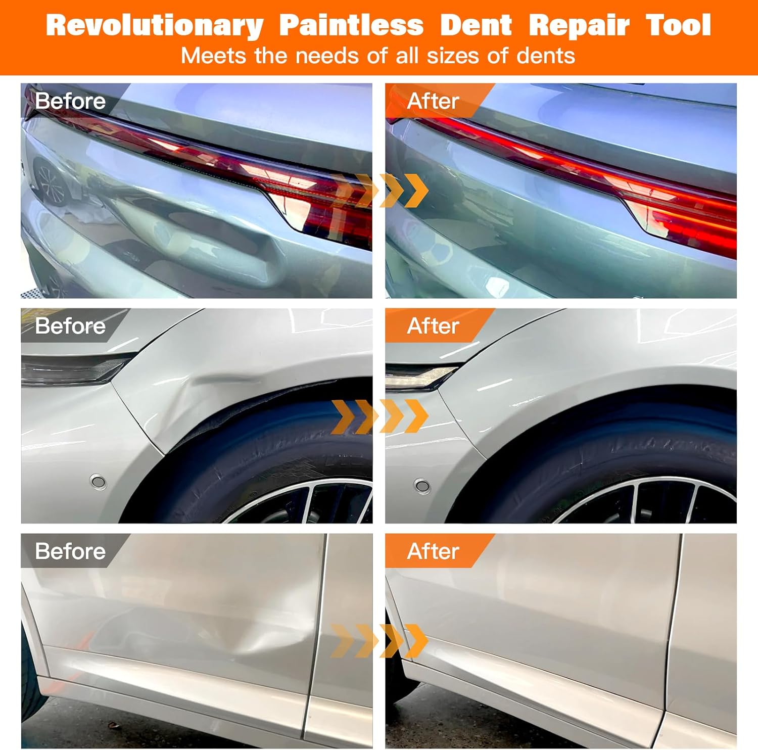 【Warm Reminder】:1,Before you pull,make sure dent puller kit firmly glued to the dent surface.2,Please make sure that the car dents are in the flat,dry surface.3,The car dents should be larger than the bottom car dent remover diameter.4,It is forbidden to use this product when the car paint is cracked or damaged in the recessed area.