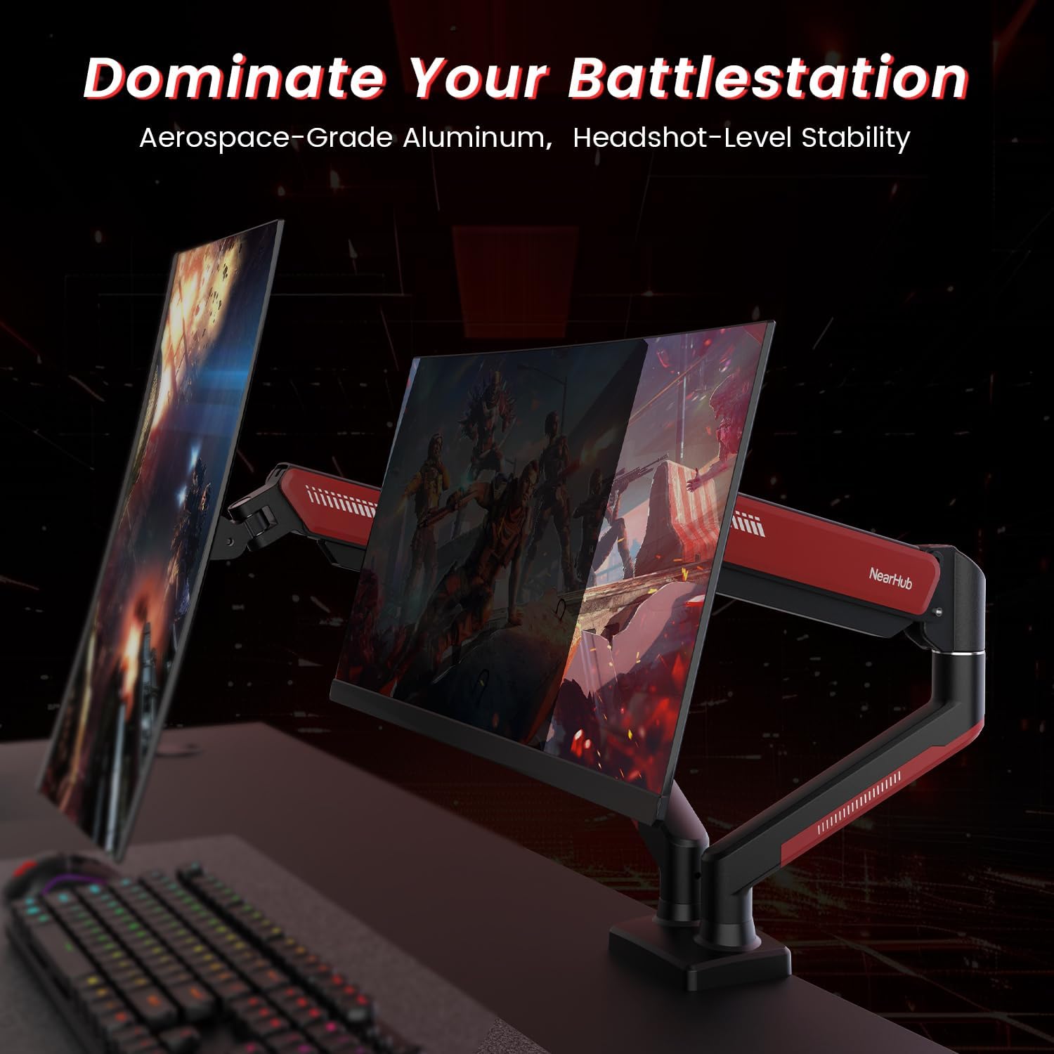 Proven Stability and Durability: Stability is crucial for gamers, NearHub dual monitor arm utilize gas spring technology tested for 30,000 cycles, enabling smooth adjustments and long-term durability, stays stable even during intense gaming sessions, providing reliable support, preventing shaking and unwanted movement.