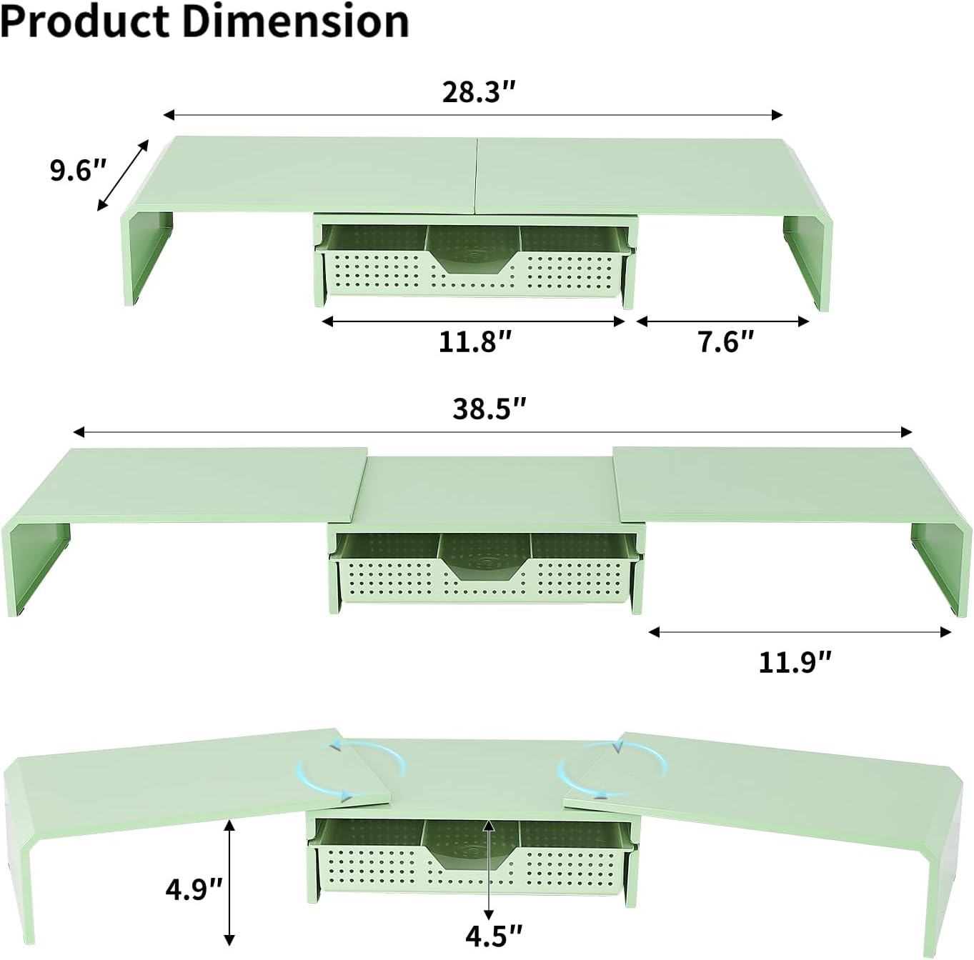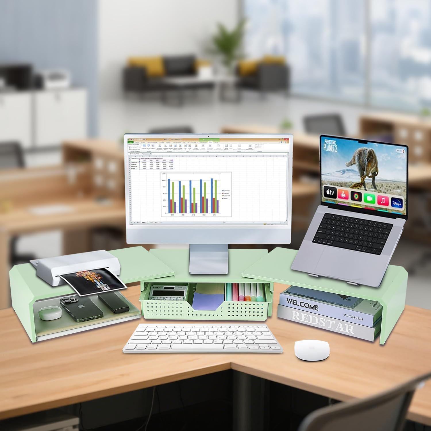 { Ample Storage } The monitor riser comes with a 3-slot drawer for office supplies and other accessories as a desk organizer. Also, there are large storage space beneath the laptop stand shelves that you can keep everything within easy reach and always well organized. Create a clutter-free desktop for yourself