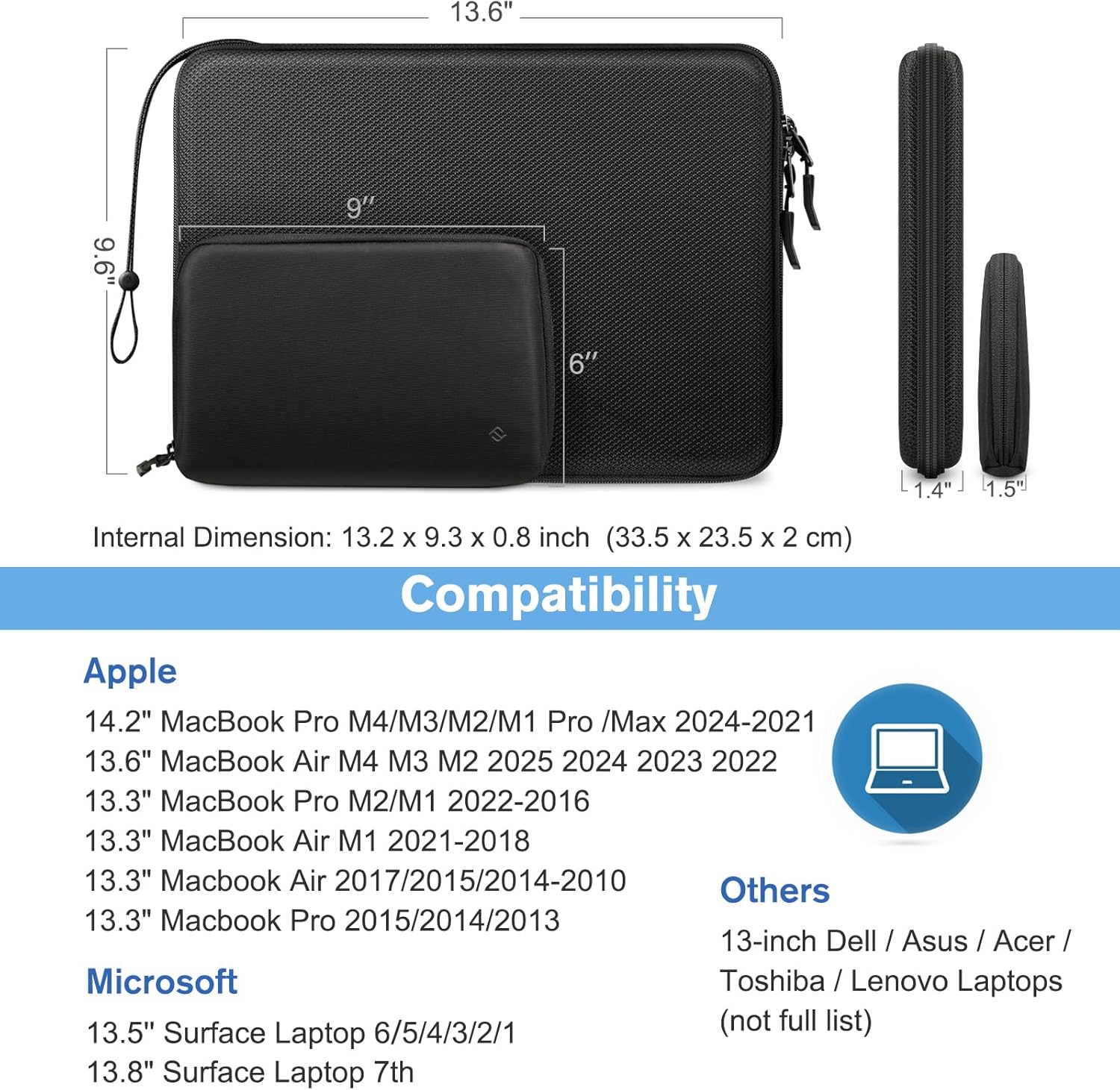 【Wide Compatibility】Internal Dimension: 13.19 x 9.25 x 0.79 inches, compatible with 13.6″ MacBook Air M4 M3 A3113 M2 A2681 (2025 2024 2023 2022), 14″ MacBook Pro M4/M3/M2/M1 A2918 A2992 A2779 A2442 Pro/Max (2024-2021), 13.3″ MacBook Air M1 A2337 A2179 A1932, 13.3″ MacBook Pro M2 M1/A2338 A2251 A2289 A2159 A1989 A1706 A1708, 13-inch iPad Pro M4 / iPad Air M2 2024,12.9″ iPad Pro 6th/5th/4th/3rd, Surface Laptop 13″, Surface Pro 12″, 13.5″ Surface Laptop 5/4/3/2/1, 13.5″ Surface Book 3/2/1, Dell XPS 13, and other tablets up to 13″.