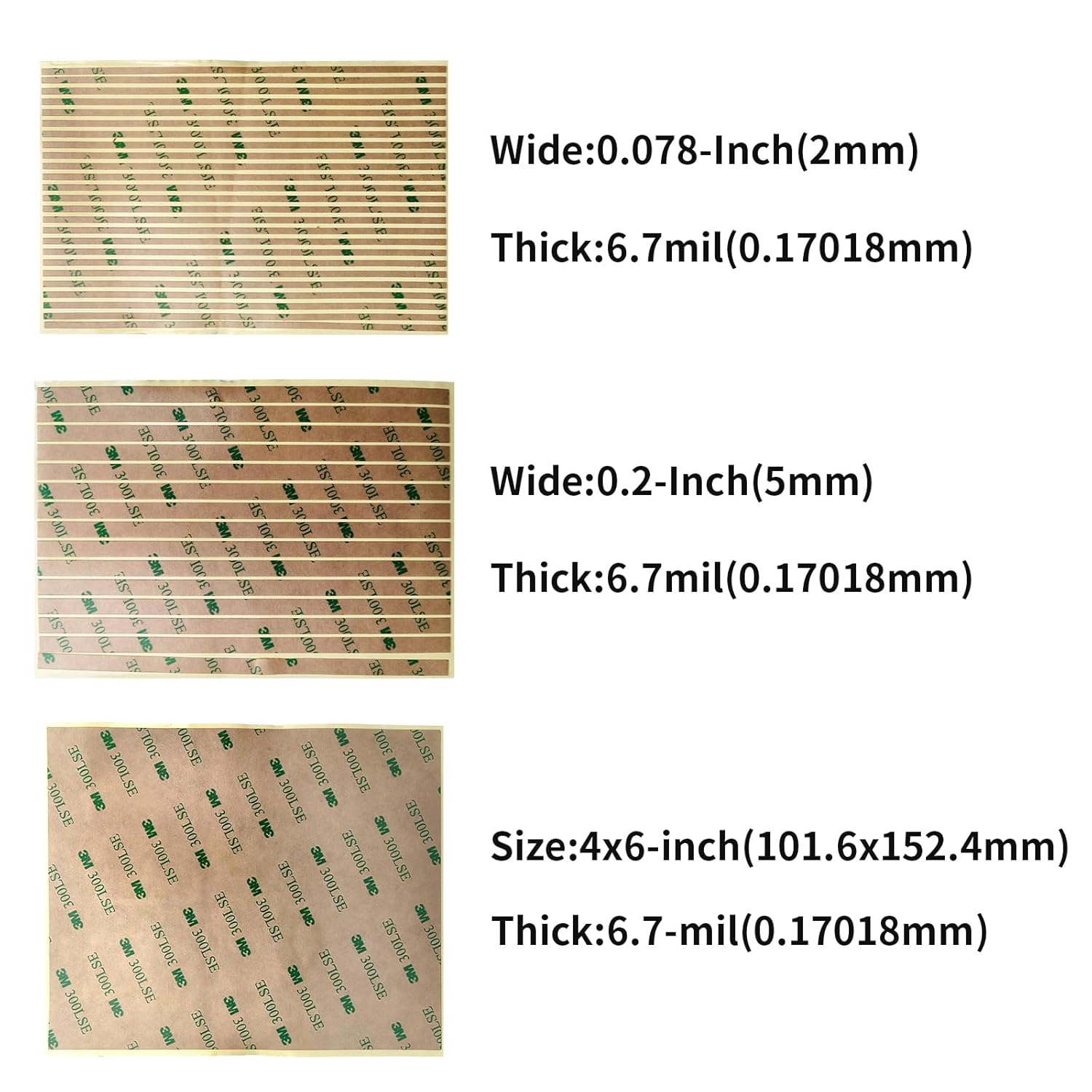Ultra thin double-sided adhesive tape Size: 4 x 6 inches Thickness: 6.7 mil (0.17 mm) Product quantity: There are a total of 5 pieces:5 piece of 25 strips of 2mm tape strips Important Notes. : Please contact us with any questions, please do not leave us any negative/neutral feedback or make any claims, we always try our best to provide a satisfactory solution for our customers.