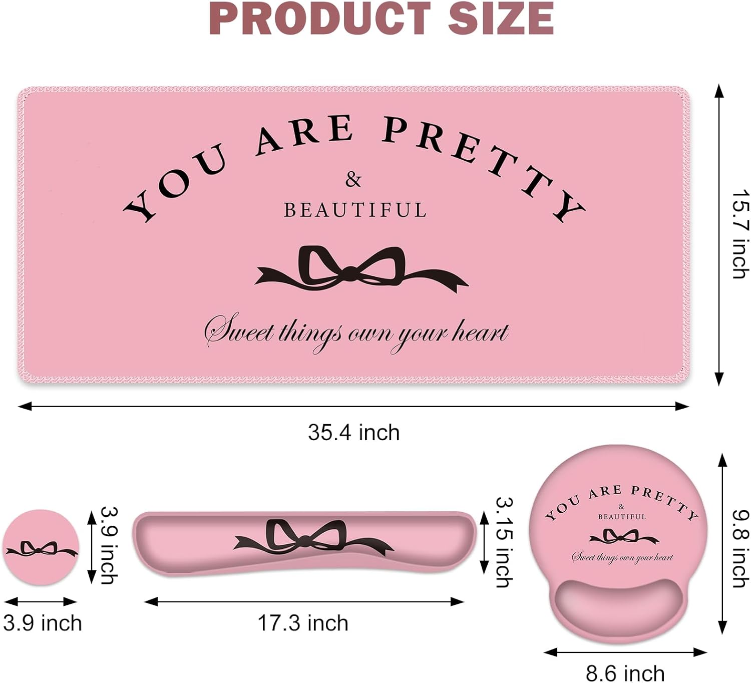 【Extended Mouse Pad & Wrist Rest Set Size】Large Desk mats on top of desks 35.4 x 15.7 inch, Wrist pad for keyboard 17.32 x 3.15 inch, Mouse pad with wrist support 9.8 x 8.6 inch, Cup coaster 3.9 inch. The large mouse pad for desk can fit wireless mice, full keyboard, laptop and computer
