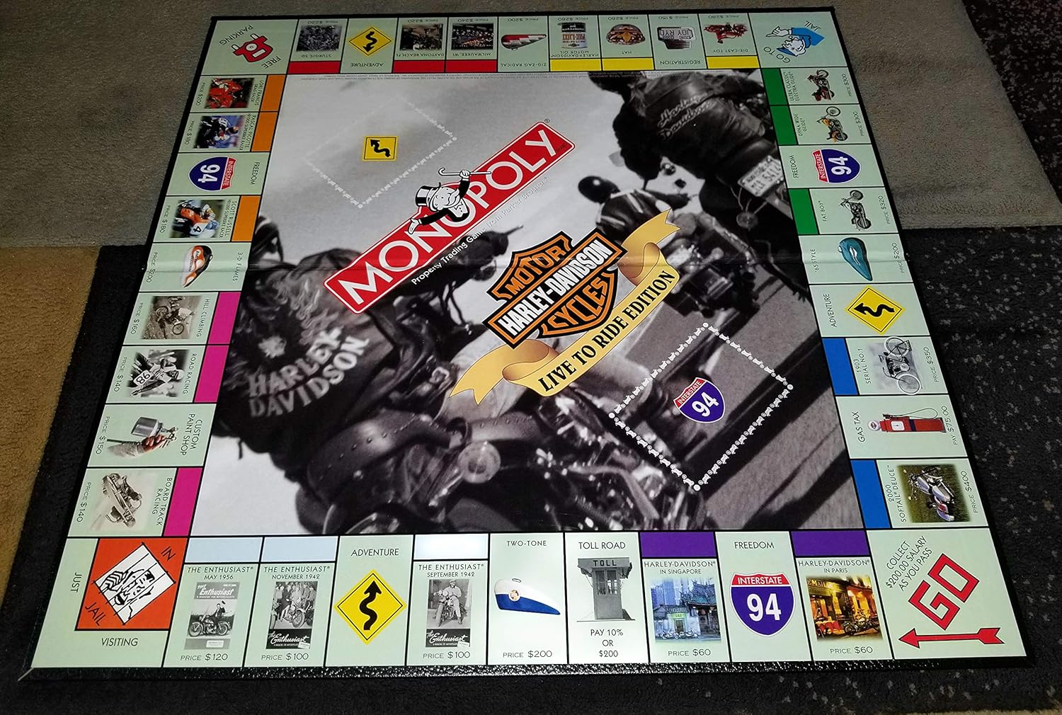 The ultimate board game and a must have collectible for the Harley-Davidson enthusiast, this game incorporates buying, selling and trading the all-time greatest motorcycles in a quest to own the most legendary bikes in Harley-Davidson history. Hit the highway with Mr. MONOPOLY and outmaneuver your opponents so that you can own the ultimate Harley-Davidson collection. Live to Ride…and Ride to Live. Nothing can compare with the freedom of riding a Harley down America’s scenic highways, byways and spectacular backroads. Now you can experience that same sensation without even riding the motorcycle. Play the all-new Harley-Davidson edition of the Monopoly Game. America’s favorite board game is a motorcycle-lover’s dream come true! Buy renowned Harley bikes, purchase rare Harley collector items and pick up exotic custom gas tanks. Build garages and run dealerships as you create a Harley-Davidson empire! Game includes: game board, property cards, custom Harley-Davidson money and banker’s tray, custom Adventure and Freedom cards, 2 custom dice, package of 32 garages, package of 12 dealerships, and 8 custom pewter game tokens.