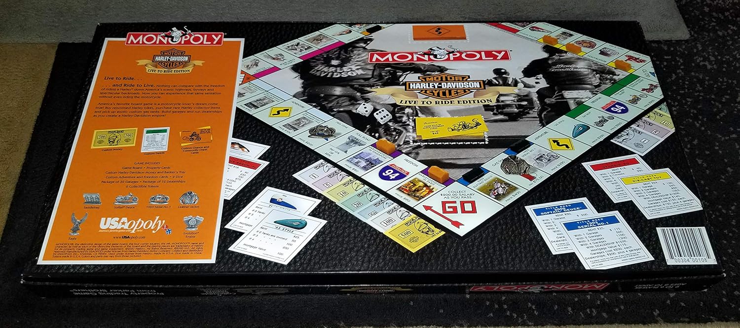 The ultimate board game and a must have collectible for the Harley-Davidson enthusiast, this game incorporates buying, selling and trading the all-time greatest motorcycles in a quest to own the most legendary bikes in Harley-Davidson history. Hit the highway with Mr. MONOPOLY and outmaneuver your opponents so that you can own the ultimate Harley-Davidson collection. Live to Ride…and Ride to Live. Nothing can compare with the freedom of riding a Harley down America’s scenic highways, byways and spectacular backroads. Now you can experience that same sensation without even riding the motorcycle. Play the all-new Harley-Davidson edition of the Monopoly Game. America’s favorite board game is a motorcycle-lover’s dream come true! Buy renowned Harley bikes, purchase rare Harley collector items and pick up exotic custom gas tanks. Build garages and run dealerships as you create a Harley-Davidson empire! Game includes: game board, property cards, custom Harley-Davidson money and banker’s tray, custom Adventure and Freedom cards, 2 custom dice, package of 32 garages, package of 12 dealerships, and 8 custom pewter game tokens.