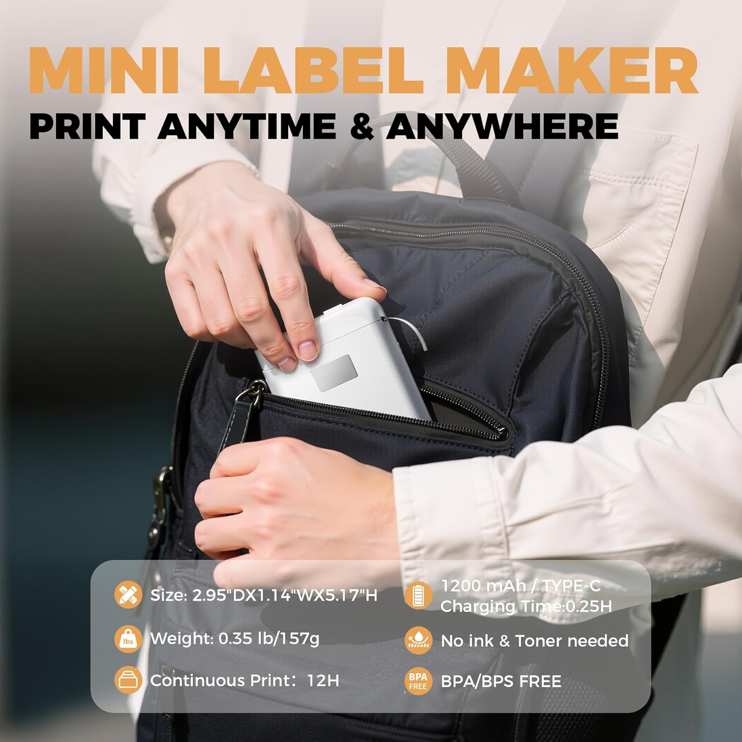 【2025 New Version】This upgraded label maker is smaller and more convenient. The D10 label maker machine with tape weighs only 157 g, can be easily used with one hand. It is about the size of your phone just taking up little space, you could probably shove it right into your purse or backpack. The label maker is equipped with a built-in serrated tearing knife, you can cut printed labels smoothly and quickly with just a light tear
