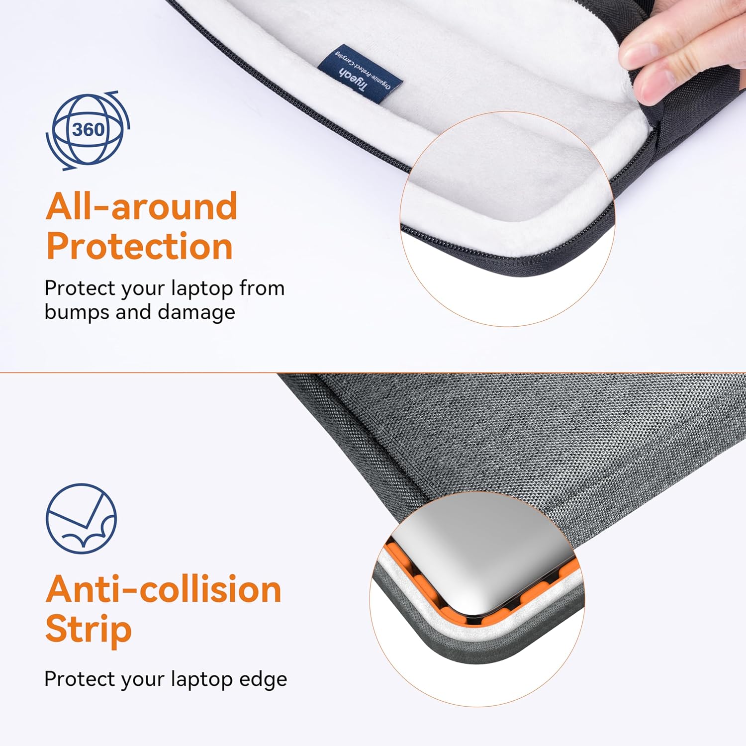 [Superior Protection]:Featuring four-layer protection system:Waterproof fabric,EVA,Soft sponge and 150D lining,this laptop bag provides all-around protection to safeguard your laptop from dings and damage. This laptop sleeve features shock-absorbing strips inside to cushion and protect your laptop if the bag slips or falls. The interior is lined with a comfortable, soft teddy fleece that prevents scratches on your laptop’s metal surfaces.