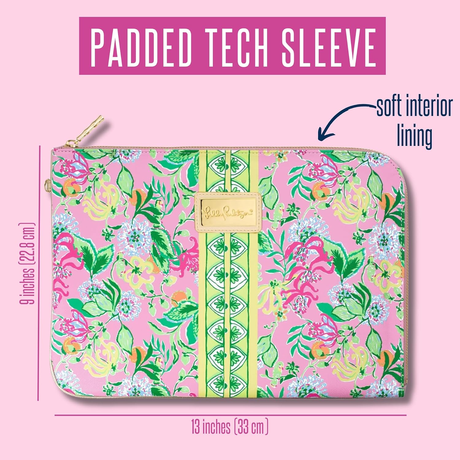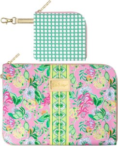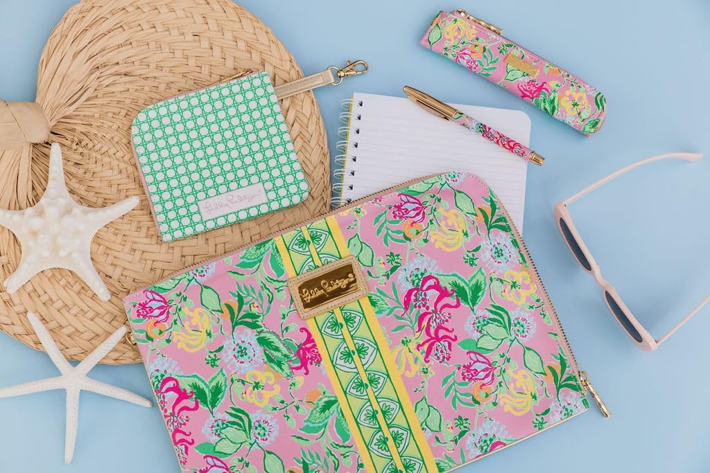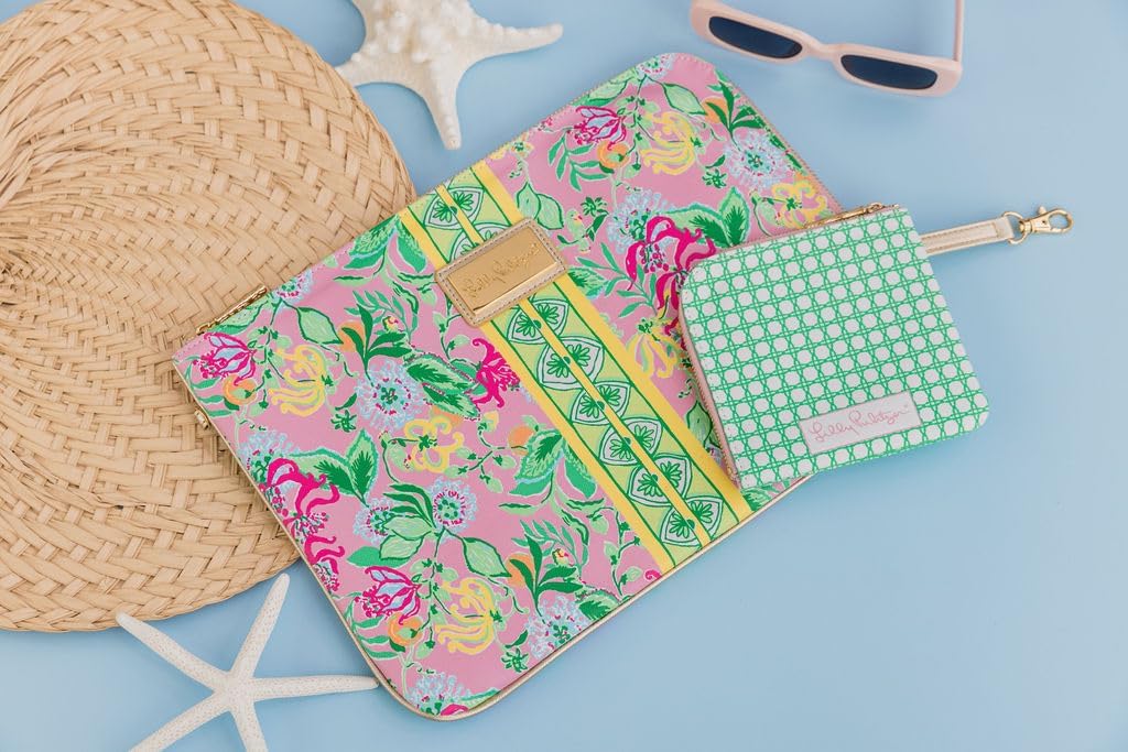 Vegan leather computer case and tech accessories pouch are featured in the shiny gold Lilly Pulitzer print, Via Amore Spritzer, with a metal logo plaque on the front