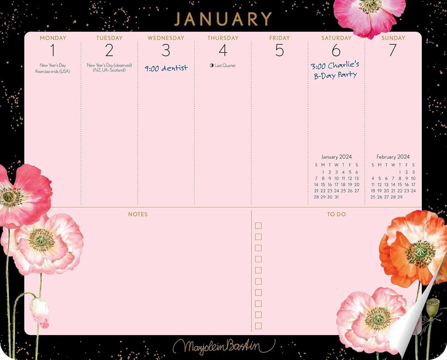 Featuring a beautiful pink poppy pattern by the renowned Dutch artist, the Marjolein Bastin 2024 Weekly Desk Pad will help you highlight weekly priorities and keep tasks in clear view while adding a stylish touch to your desk or countertop.