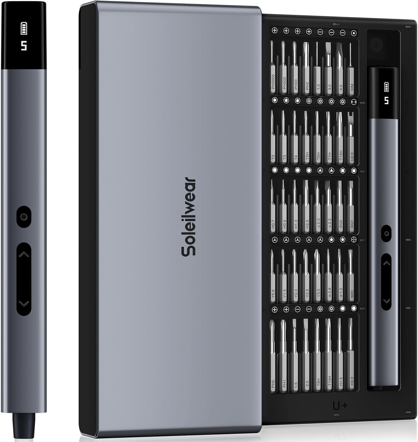 【Latest 5 Torque Upgrade & More Powerful】 The Soleilwear mini electric screwdriver features 5 adjustable torque levels** (0.15-0.75N.m), giving you precise control to handle various tasks. The manual torque of 7N.m provides extra power for manual screwdriving when needed.Designed for stability and ease of use, this electric screwdriver cordless is perfect for laptops, smartphones, MacBooks, toys, drones, keyboards, glasses, watches, and most other electronic devices. Save time and effort with a tool built for convenience and efficiency.