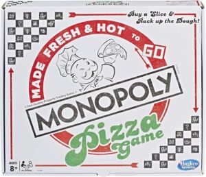 Who wants pizza? In this Monopoly pizza board game, players move around the gameboard, trying to buy as many types of pizza as they can — from classic pepperoni or Spinach to Mushroom. Instead of buying up properties, players aim to collect a color set, which corresponds to a Type of pizza such veggie love’s, barbecue chicken or even Mac and cheese. A full set of flavors combines to make an awesome new pizza, giving those cards a higher value at the end of the game. At the end of the game, The player who collected the most pizza slices wins. The Monopoly pizza game makes a great gift for kids ages 8 and up, and is fun way to entertain the kids Whether you’re stuck inside on a rainy day, or gathering together for family game night.