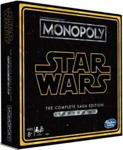 The Monopoly: Star Wars complete saga edition board game is a galactic celebration of all 3 Star Wars trilogies combined into one game With game play inspired by the Star Wars universe and iconic Star Wars artwork this game is a must for Star Wars fans. Properties include planets and droids, and instead of houses and hotels, this edition features tie fighters and X-wings. The last player left with credits when all other players go bankrupt, is the winner.