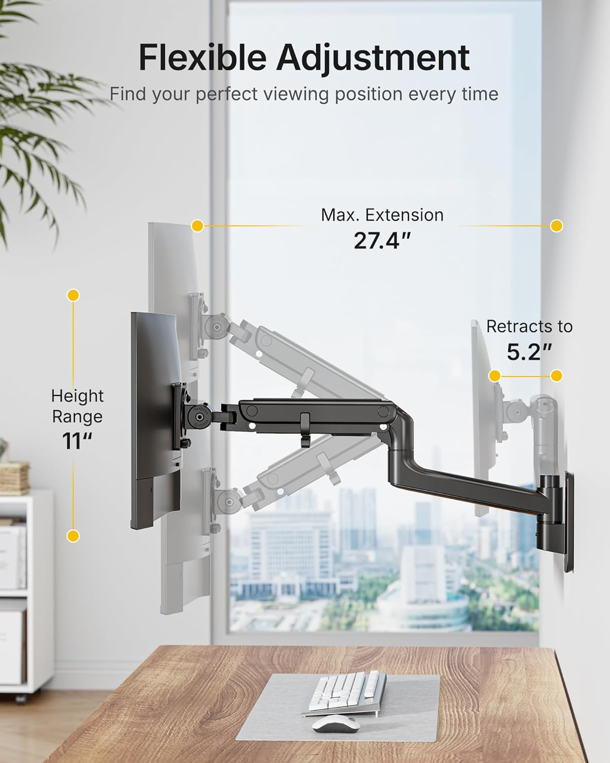 【Full Motion Adjustments】Enjoy unmatched flexibility with +75° to -75° tilt, ±90° swivel, 180° screen rotation. When not in use, the arm can be retracted close to the wall of only 5.2″. This wall mount monitor arm extends up to 27.4″ with a 11″ height adjustment range, making it easy to find a more comfortable and ergonomic viewing angle—perfect for long hours of work or gaming