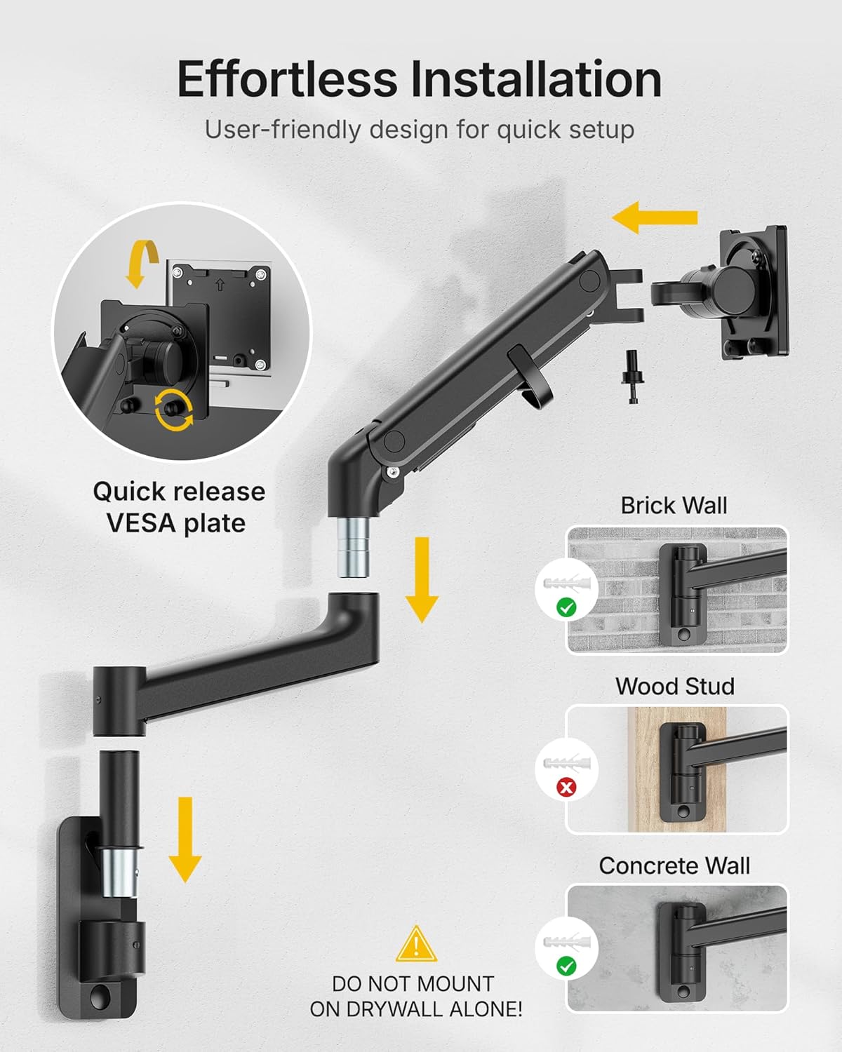 【Easy Installation】Designed for wood studs, brick, and concrete walls (Note: Please do not mount to drywall alone). The quick-release VESA plate makes installation effortless, allowing you to set up this monitor wall mount within 10 minutes. Ideal for use in office, home, studio and gaming setup, which is a multifunctional tool to enhance your efficiency and productivity