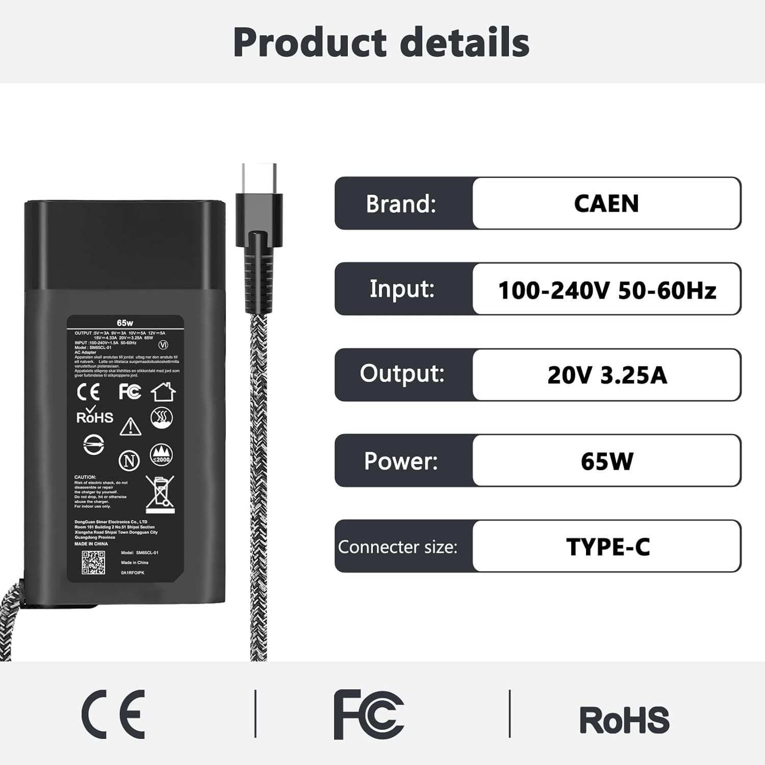 USB C Type-C Charger 65W , Input:100-240V~1.5A, 50-60Hz, Output:5V 3A /9V 3A /12V 5A /15V 4.33A /20V 3.25A, MAX Power 65W(Compatible with 45W 65W HP Laptop Charger USB C)