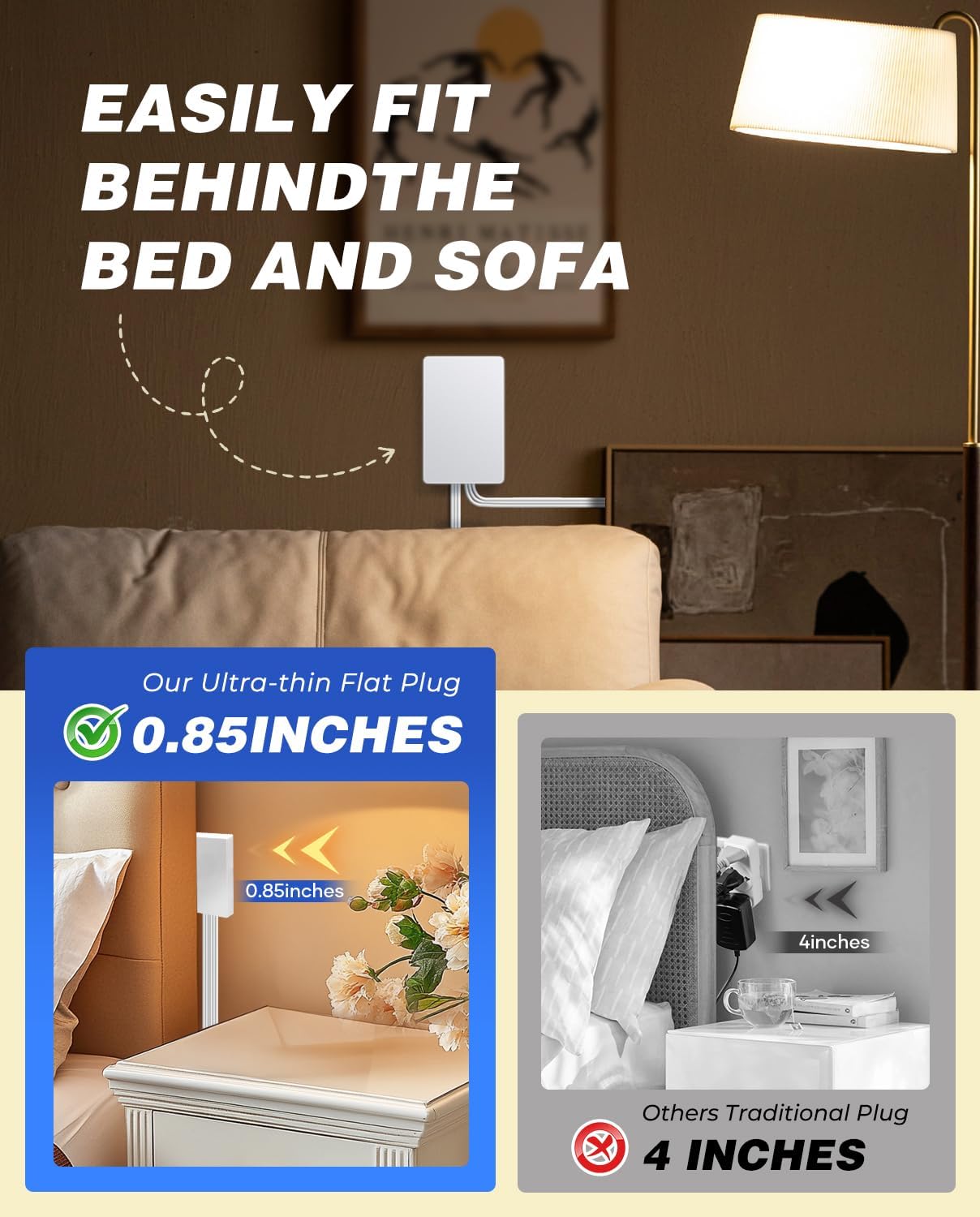 【ELEVATE YOUR SPACE】Upgrade your space with our flat plug power strip. Effortlessly hide flat extension cord for a sleek, organized look in any room. Keep your home safe and stylish with our flat wall plug extension cord.