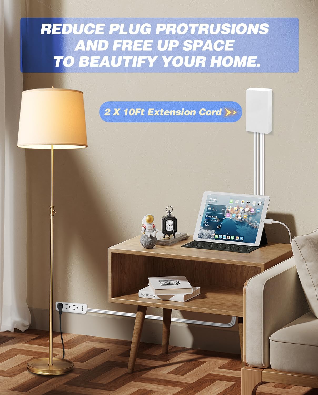 【SIMPLIFY YOUR SETUP WITH OUR OUTLET EXTENSION】Just attach the flat plug power strip to your duplex receptacle, and voila! Gain access to 3 outlets with our ultra-thin outlet cover extension cord, reaching up to 10 feet. Experience the convenience of flat extension cord in one compact solution.